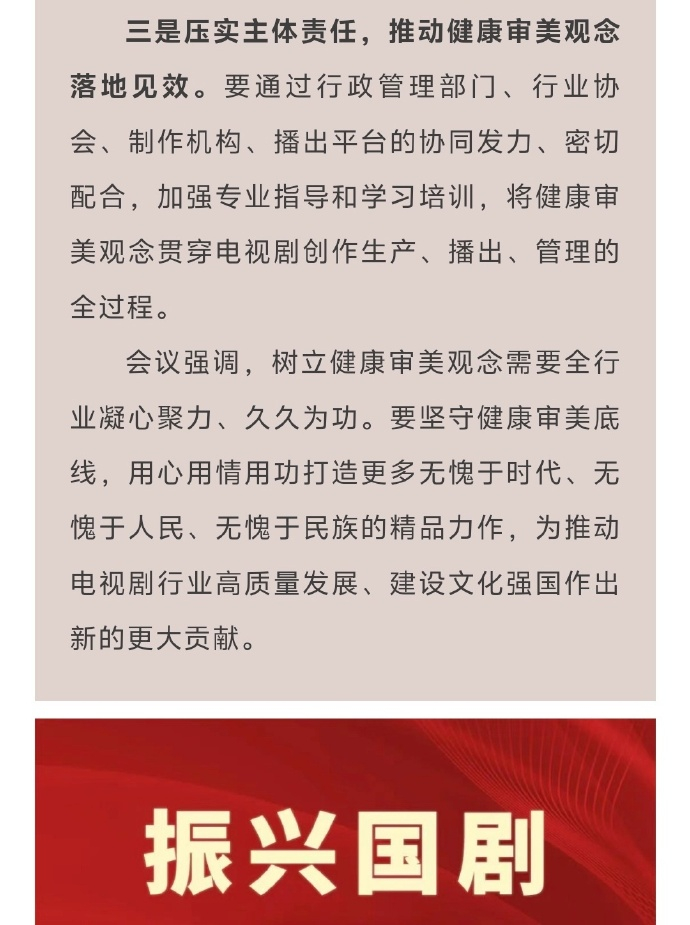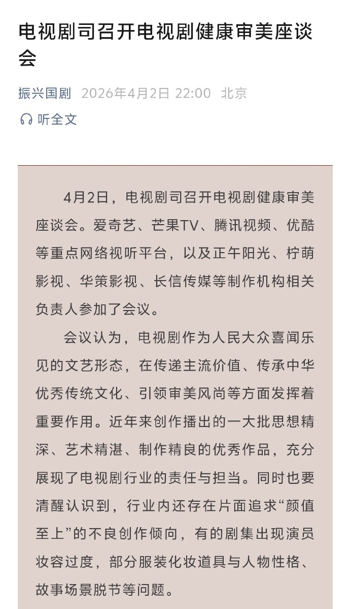 【广电总局要求电视剧杜绝颜值崇拜】官方召开电视剧健康审美座谈会 4月2日,电视剧司召开电视剧健康审美座谈会。爱奇艺、芒果TV、腾讯视频、优酷等重点网络视听平台,以及正午阳光、柠萌影视、华策影视、长信传媒等制作机构相关负责人参加了会议。会议认为,电视剧作为人民大众喜闻乐见的文艺形态,在传递主流价值、传承中华优秀传统文化、引领审美风尚等方面发挥着重要作用。近年来创作播出的一大批思想精深、艺术精湛、制作精良的优秀作品,充分展现了电视剧行业的责任与担当。同时也要清醒认识到,行业内还存在片面追求“颜值至上”的不良创作倾向,有的剧集出现演员妆容过度,部分服装化妆道具与人物性格、故事场景脱节等问题。会议指出,树立健康审美观念,是关乎文艺方向、关乎文化自信、关乎行业未来的重要命题。电视剧行业要深入学习贯彻习近平文化思想,坚持以人民为中心的创作导向,坚持守正创新,坚持真善美的价值内核,深入生活、扎根人民,让电视剧作品真正体现质朴之美、自然之美、内涵之美。一是深刻认识树立健康审美观念的重要意义。要把健康审美观念融入创作全过程,让电视剧作品成为彰显中国精神、中国价值、中国力量的生动载体。人民群众对电视剧的需求,从来不止于颜值“好看”,而在于故事“耐看”,在于作品的思想内涵、情感共鸣和文化滋养,实现艺术价值与社会价值相统一,既“娱人”,更“育人”。二是坚决摒弃畸形审美,坚守电视剧创作审美底线,坚定实现从“明星中心制”转向“剧本中心制”。要杜绝“颜值崇拜”,坚持“内容为王、人物为本”,让人物有血有肉、有温度、有灵魂,最基本的一点要求是“演什么要像什么”。要避免“颜值至上”和“流量依赖”,多关注演技和作品。要让服化道为人物塑造和故事表达服务,与人物形象相匹配,整体上呈现健康向上的精神特质,体现中国气派、中国风格,增强文化自信。三是压实主体责任,推动健康审美观念落地见效。要通过行政管理部门、行业协会、制作机构、播出平台的协同发力、密切配合,加强专业指导和学习培训,将健康审美观念贯穿电视剧创作生产、播出、管理的全过程。会议强调,树立健康审美观念需要全行业凝心聚力、久久为功。要坚守健康审美底线,用心用情用功打造更多无愧于时代、无愧于人民、无愧于民族的精品力作,为推动电视剧行业高质量发展、建设文化强国作出新的更大贡献。