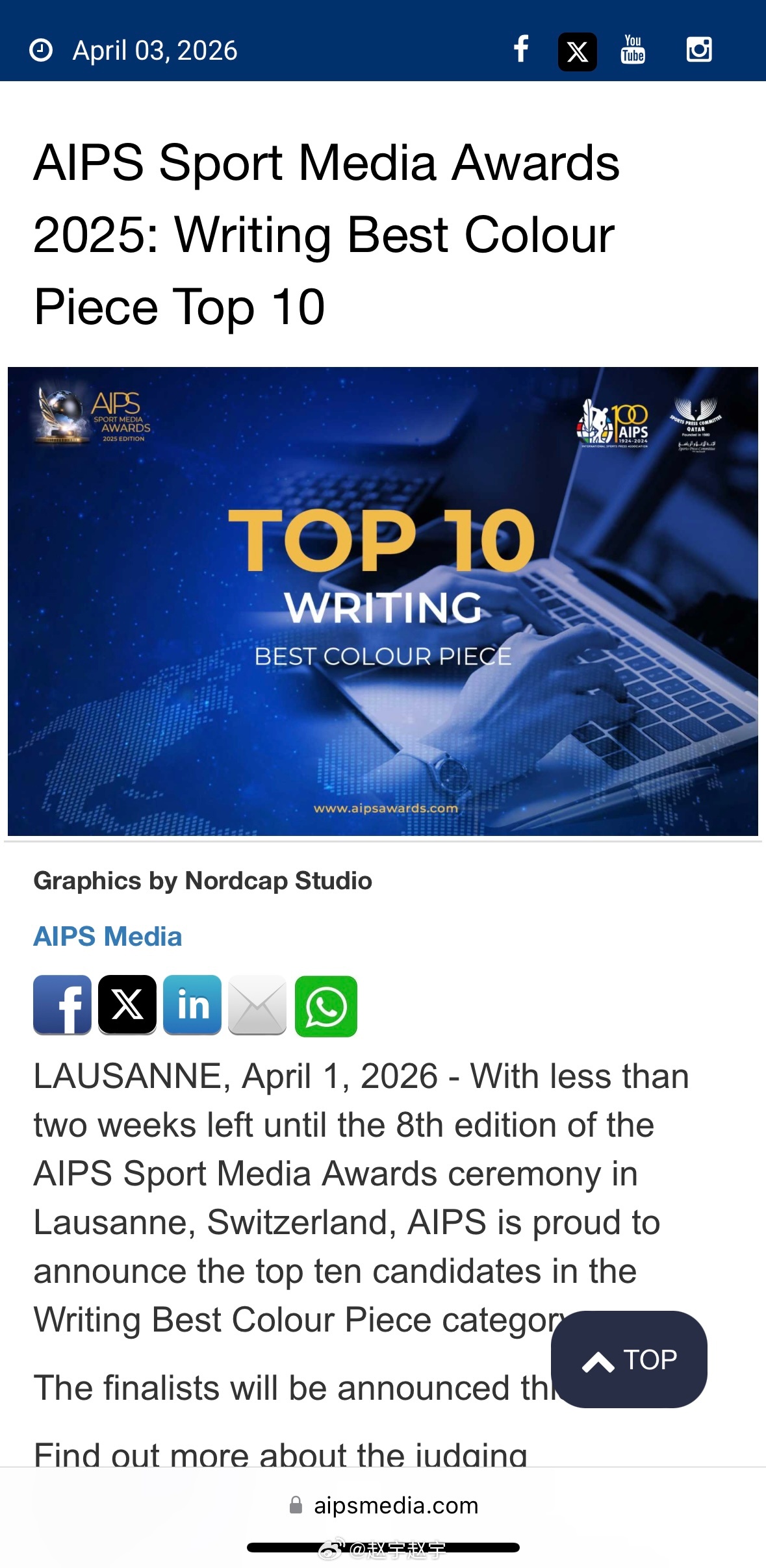 又到一年一度陪跑时刻,年年陪跑年年跑。感谢国际体育记者协会(AIPS)最佳特写写作(Best Colour Piece)提名,被提名文章为《获刑20年,李铁的底色》。今年已陪跑至前十,耐力有所提升。名次不重要,重要的是这种谁也不认识谁、只拿作品说话的评奖氛围。