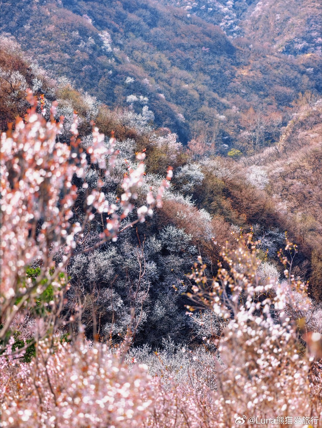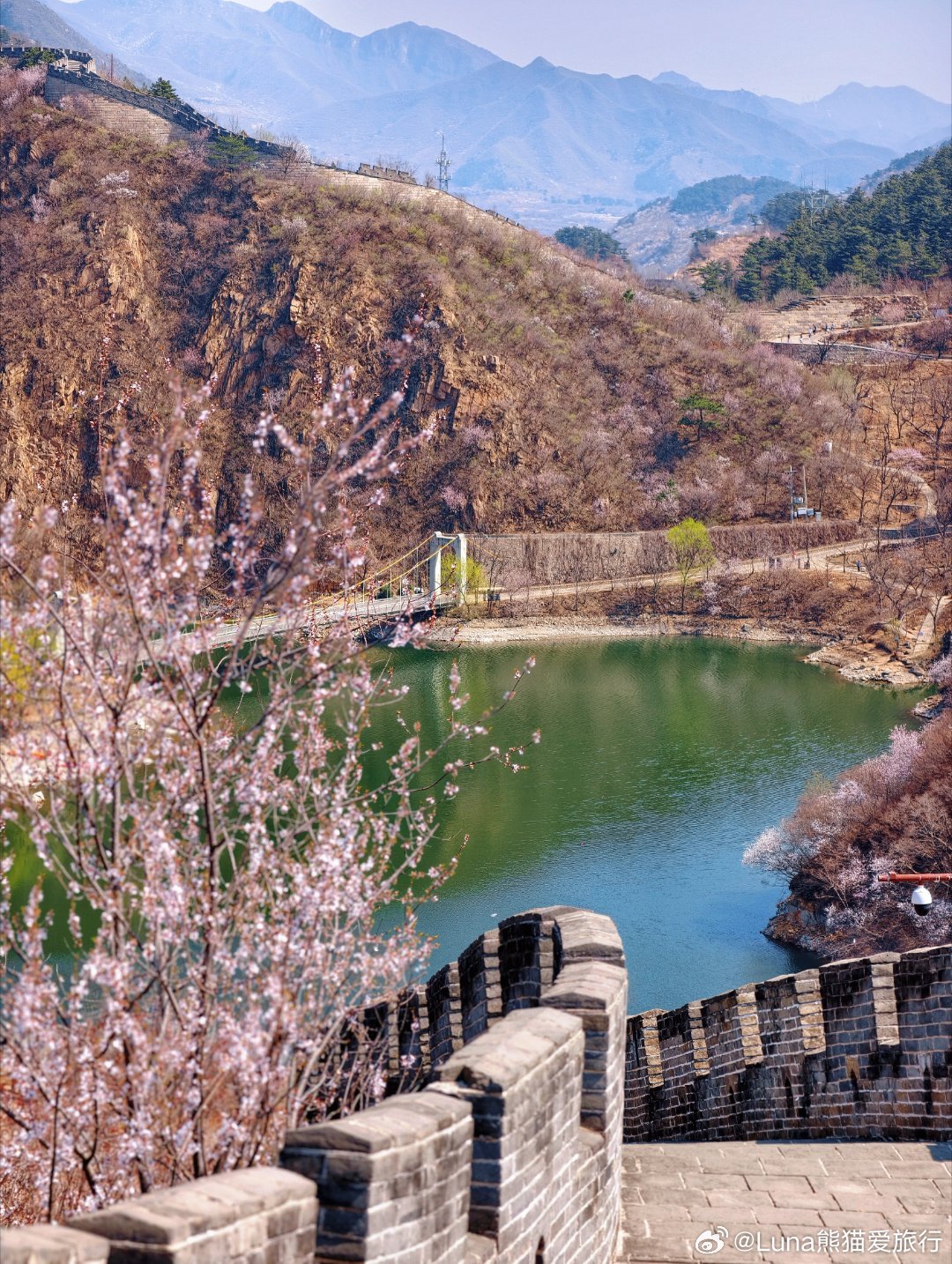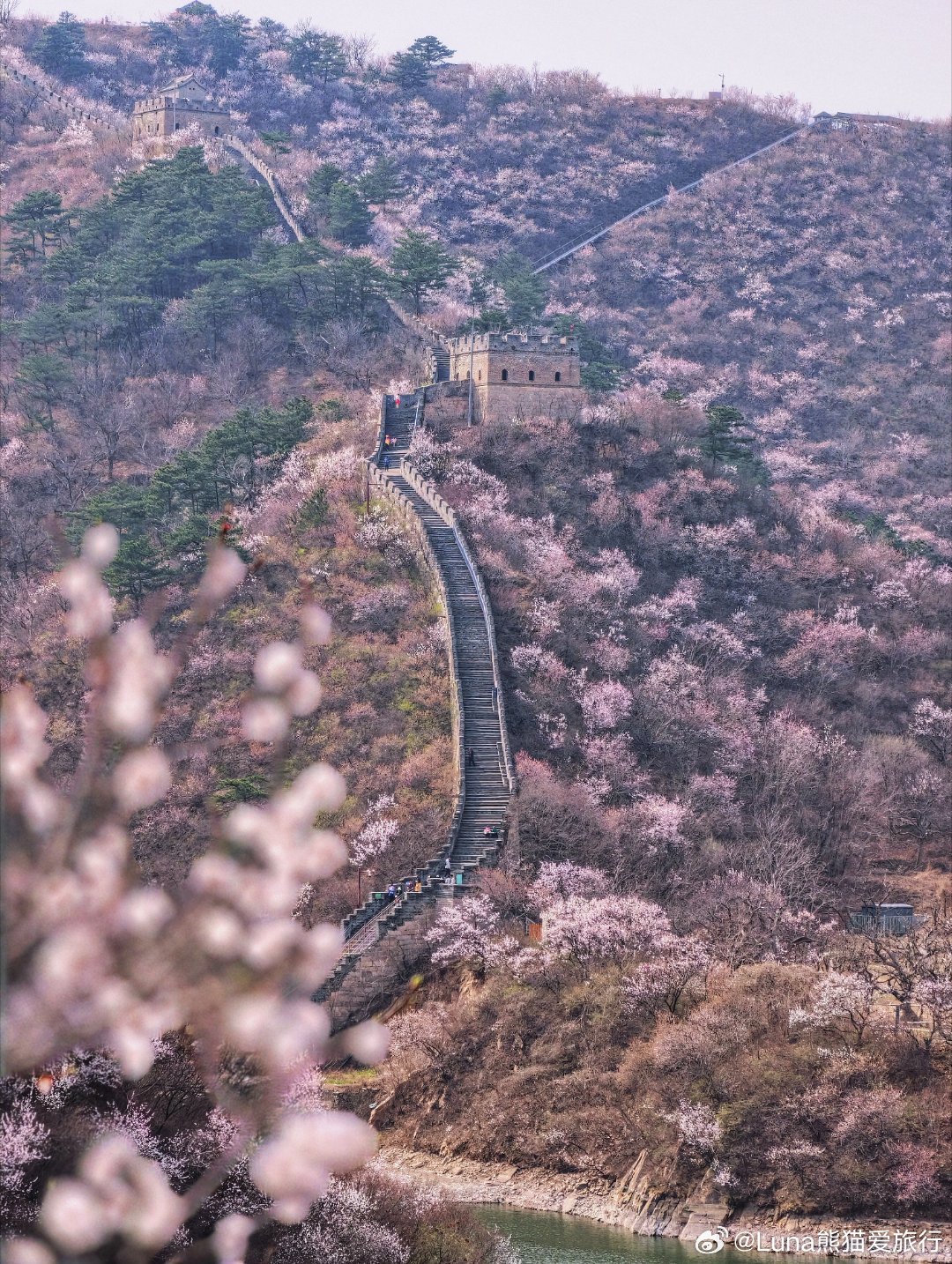 🌸现在的花况目前花开 90%,抓住最后的观赏期山桃花一片片铺在山坡上山杏花开得很炸野生桃花点缀在长城脚下花、湖水、长城同框,非常春天限定属于那种抬头是花,低头是水,回头是长城的画面。