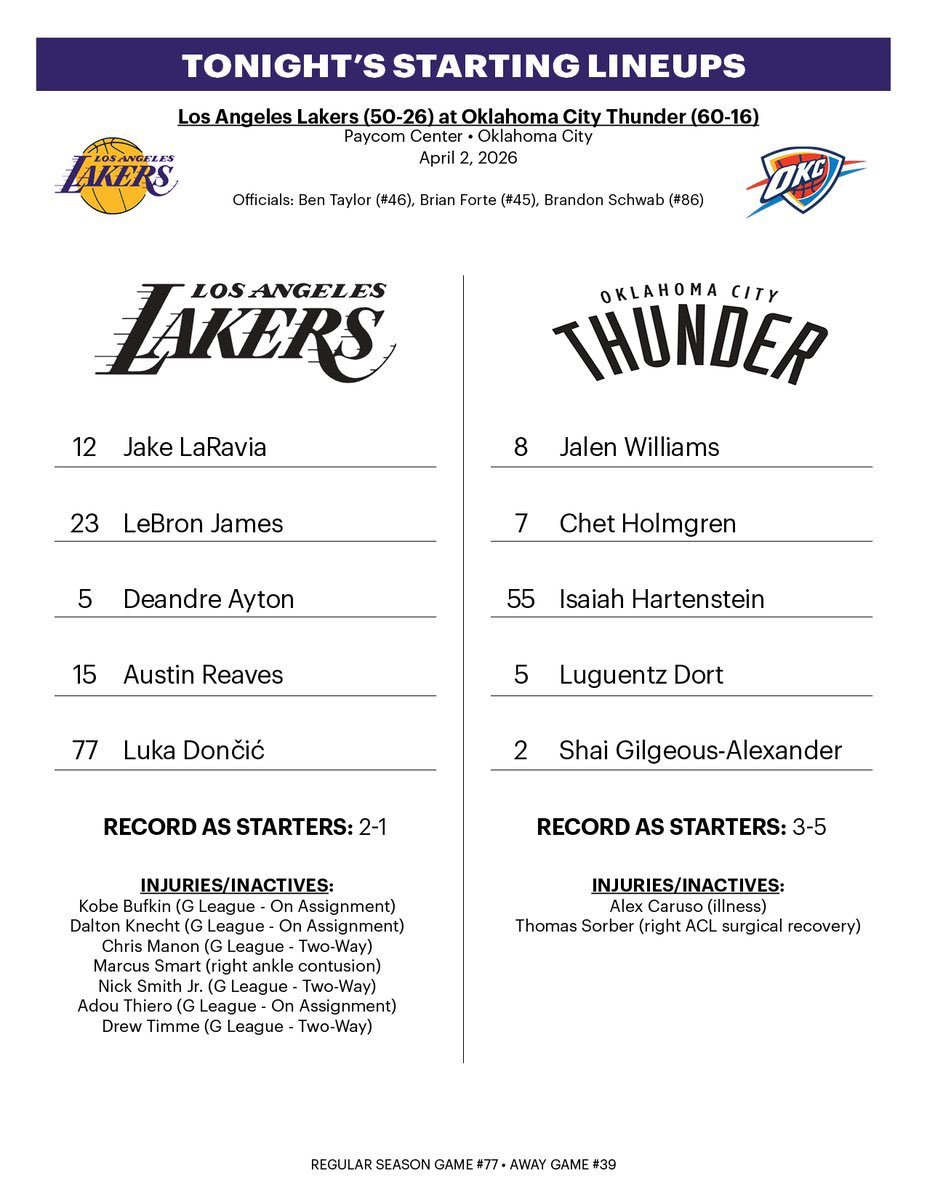 湖人首发:东契奇、里夫斯、拉拉维亚、詹姆斯、艾顿雷霆首发:亚历山大、多尔特、杰威、切特、哈藤
