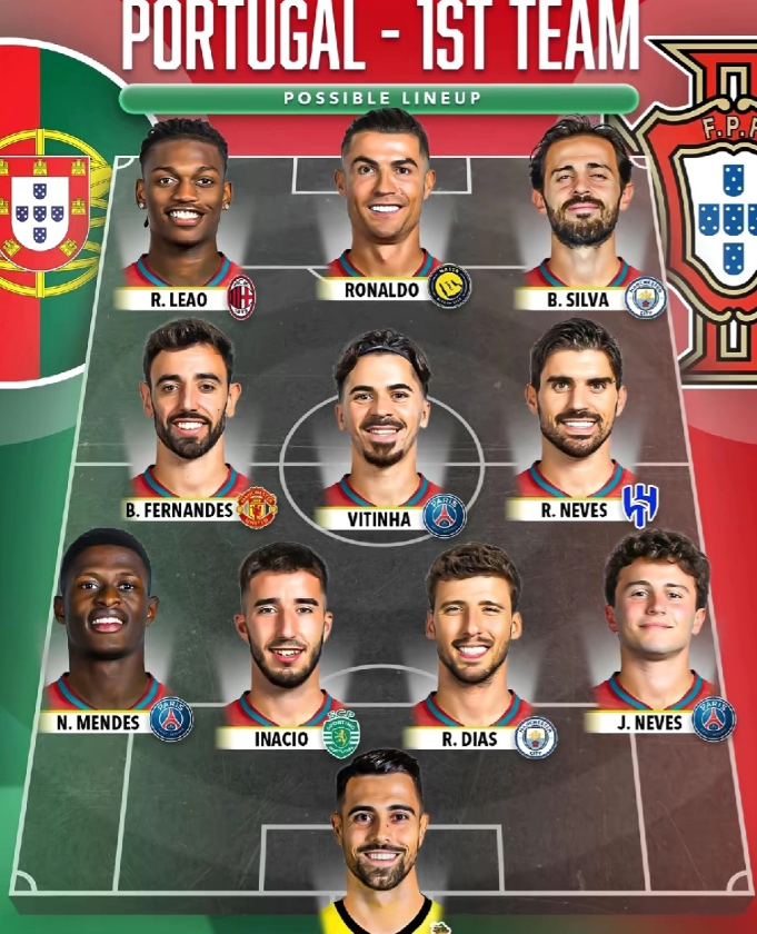葡萄牙这个阵容真的具备夺冠实力,如果C罗年轻10岁,那这阵容真是逆天。这套阵容主要以大巴黎和曼城为班底,中场和后卫都是世界级,葡萄牙真是人才济济,人口只有一千多万的小国家,足球这么发达,真令人羡慕啊。 锋线 : 莱奥,C罗,席尔瓦 中场 : 维蒂尼亚,B费,内维斯 后卫 : 门德斯,伊纳西奥,迪亚斯,内维斯 门将 : 科斯塔