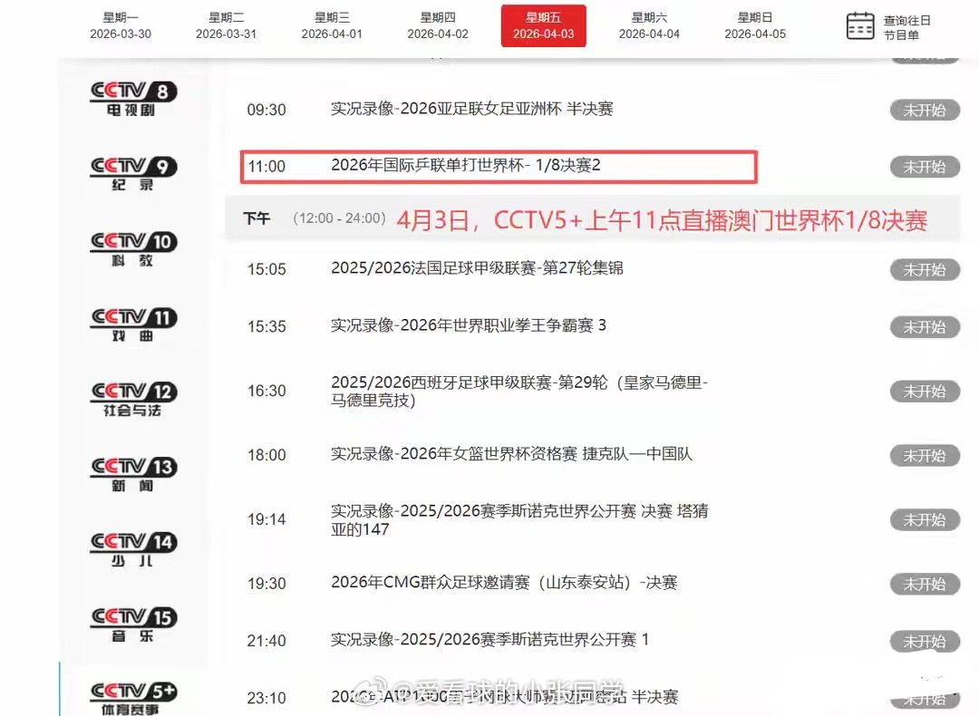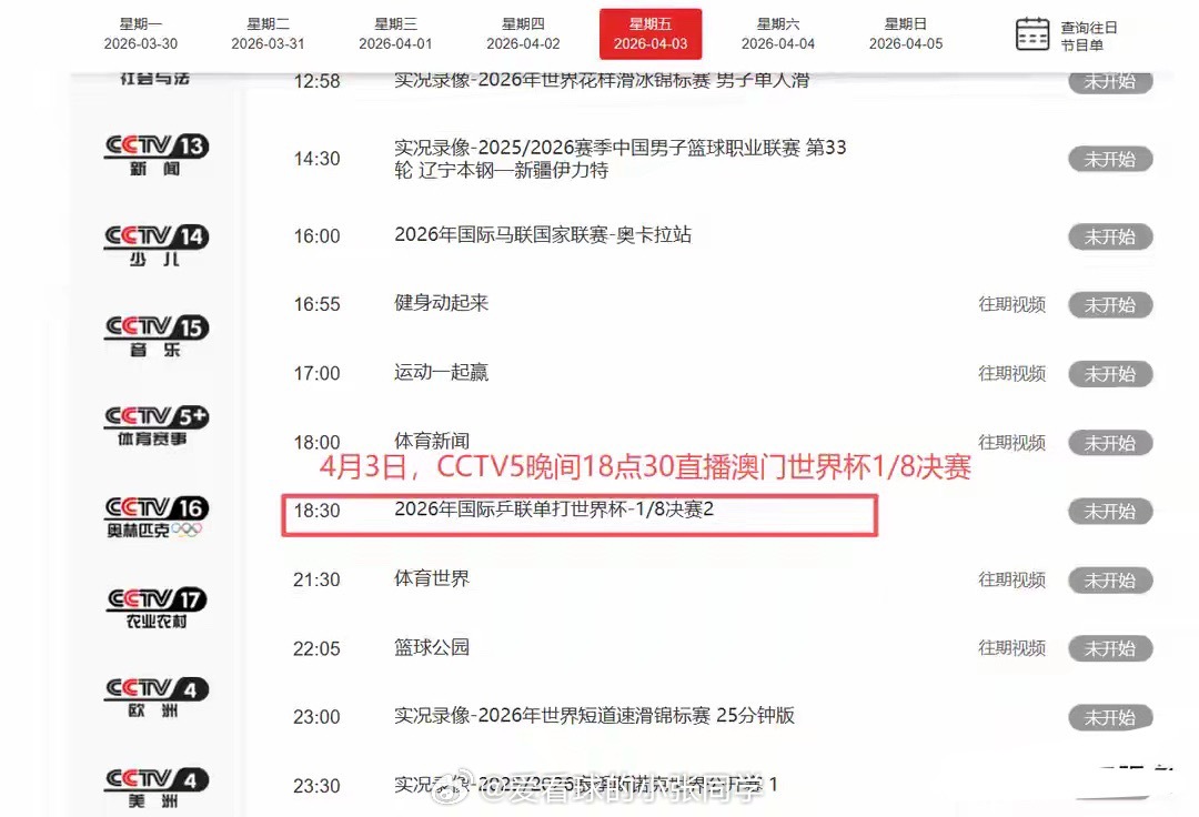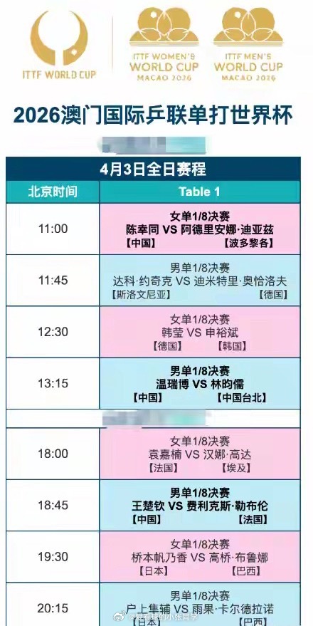 北京时间4月3日,澳门世界杯第5个比赛日,继续进行男女单1/8决赛的争夺!在上一个比赛日,国乒2人无缘女单8强,20岁的覃予萱1-4输给德国名将温特,国乒小将在攻防两端确实还有极大的提升空间,而且状态需要更稳定一些!蒯曼在内战中,2-4不敌队友孙颖莎,莎莎是卫冕冠军,不管谁遇到她,也都是下风球!还有2场中日焦点战,国乒均大比分获胜,让日乒女单损失惨重,接近全军覆没,只剩桥本帆乃香!王曼昱4-0横扫伊藤美诚,鳗鱼没有让对手赢下一局胜利,打得太强势了,她是日本队最大克星,像早田希娜、张本美和、伊藤美诚等球员,只要遇到王曼昱,赢球希望渺茫!王艺迪4-1击溃日乒一姐张本美和,攻防两端的发挥都很完美,可能也是2026年至今发挥最好的一场!赛后接受采访,大迪表示自己的发挥比想象中更好一些,张本美和的状态非常好,自己就是去拼她。赛前准备非常充分,总体发挥比较不错,下一轮对阵温特,对手打球质量非常高,做好困难的准备,慢慢和她周旋!国乒在今天只有3场比赛,陈幸同、王楚钦、温瑞博出战!上午11点,女单1/8决赛,陈幸同VS迪亚兹!迪亚兹是孙颖莎的闺蜜,两人建立了深厚友谊,曾经迪亚兹来中国,她和莎莎经常一起训练,其实和国乒很多球员都算比较熟悉!陈幸同的实力在迪亚兹之上,稳扎稳打,进入8强问题不大!下午13点15,男单1/8决赛,温瑞博VS林昀儒!这场比赛,国乒小将想要爆冷,其实有一定难度,林昀儒是比张本智和、雨果更稳定的球员,而且攻防两端的技术很扎实。对于温瑞博来说,也不用考虑太多,积极调动自己,将实力全部发挥出来即可!晚间18点45,男单1/8决赛,王楚钦VS费利克斯勒布伦!王楚钦在去年无缘世界杯金牌,他和林诗栋都被雨果击败,如今国乒世界第1的目标就是收复失地,接下来的每一场都是决战。王楚钦职业生涯面对费利克斯勒布伦,保持不败战绩,大头的优势比较大,但也不能掉以轻心,早早进入比赛状态,攻防强度拉满!其他几场外协球员的比赛,上午11点45,约奇克VS奥恰洛夫;中午12点30,韩莹VS申裕斌;晚间18点00,袁嘉楠VS汉娜高达;19点30,桥本帆乃香VS布鲁娜;20点15,户上隼辅VS雨果!中央5台在今天的直播安排已经出炉,继续转播乒乓球赛事!上午11点00,CCTV5+直播澳门世界杯1/8决赛,陈幸同、温瑞博在这个时间段出战!晚间18点30,由CCTV5负责转播世界杯,王楚钦大战勒布伦!