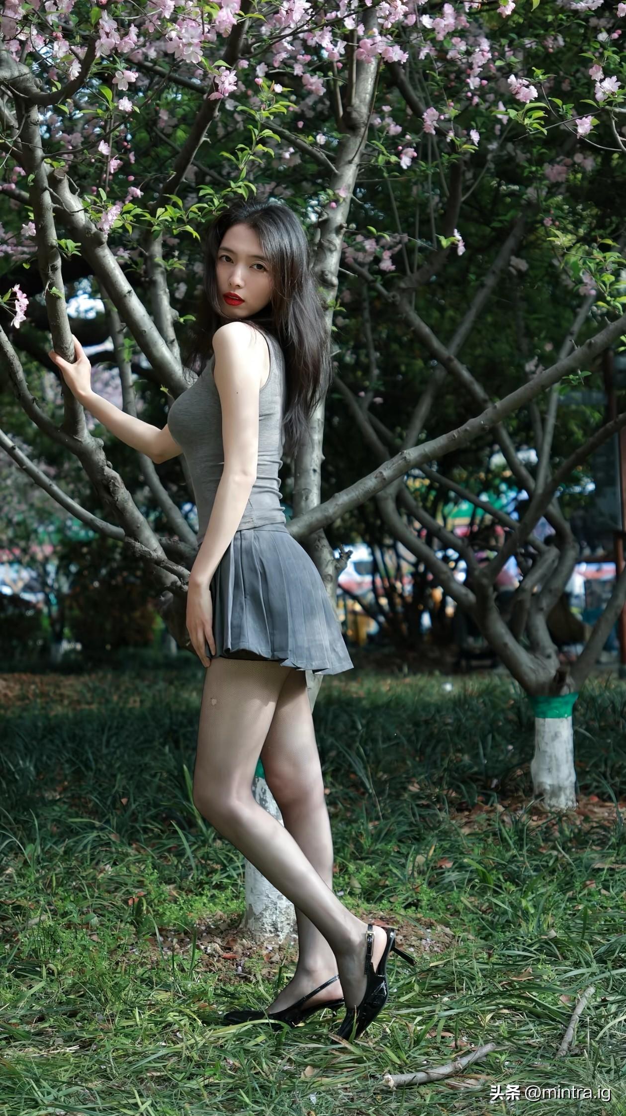 春日的风,吹过湖面,也吹乱了发梢。 灰调的穿搭,在满树繁花与粼粼波光里,成了最温