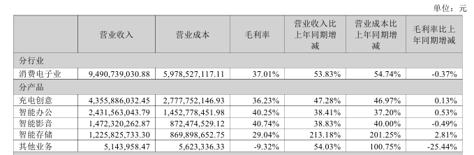 分品类来看,充电创意、智能办公、智能影音三大传统板块收入分别为43.56亿元、24.32亿元、14.72亿元,同比增长47.28%、38.41%、38.83%,分别占据总营收的45.90%、25.62%、15.51%。