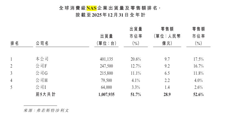 根据其在港交所最新招股书中披露的数据显示,2025年,绿联已经超过业内的一众“老前辈”和新锐势力(推测公司F系Synology群晖、公司G为QNAP威联通、公司H为Buffalo巴法络、公司I为极空间ZhiTi),在消费级NAS产品上一骑绝尘,以断层式领先夺下了出货量和零售额的“双料冠军”。