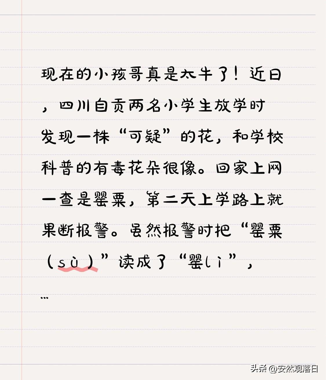 现在的小孩哥真是太牛了!近日,四川自贡两名小学生放学时发现一株“可疑”的花,和学校科普的有毒花朵很像。回家上网一查是罂粟,第二天上学路上就果断报警。虽然报警时把“罂粟(sù)”读成了“罂lì”,但警方还是“秒懂”。民警确认是野生罂粟后,当即铲除并踏勘周边。