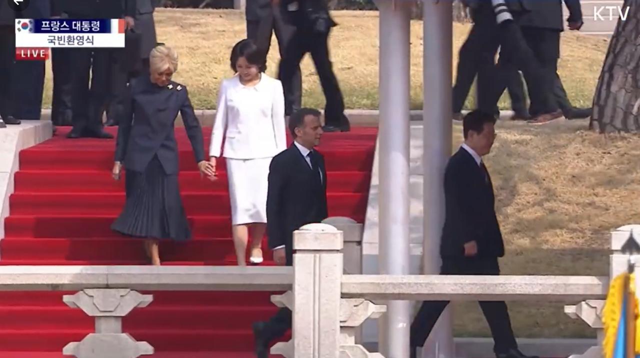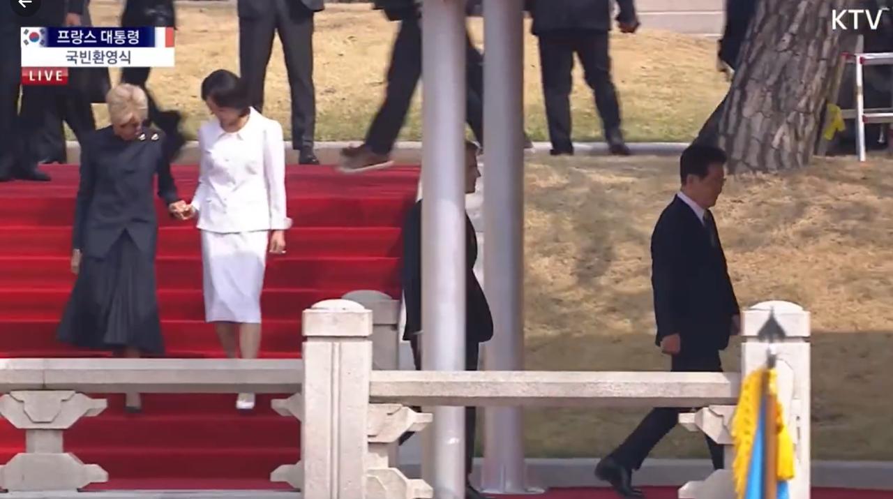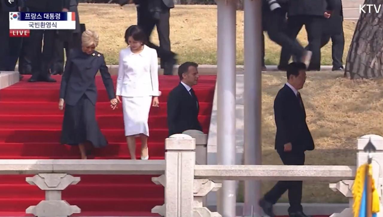 马克龙夫妇出席韩国欢迎仪式,布里吉特下台阶的时候还与金惠景牵手!4月3日李在明夫妇为法国总统夫妇举行隆重的欢迎仪式,从下车到举行仪式的地方铺的全是红毯,欢迎现场很是热闹。 布里吉特一路走在红毯上好似走秀,而且选择的时装套裙也优雅美,在下台阶的时候她主动伸手去牵着韩国第一夫人的手,她们手牵手下台阶温馨有爱。 不得不说布里吉特的情商高,一开始走红毯是各走各的,走到有台阶的地方就牵手金惠景,因为两位夫人都穿着高跟鞋,然而马克龙与李在明走在前面,都没有去照顾自己的妻子。 欢迎仪式上全是媒体记者,各走各的显得彼此生疏,牵手互动显得关系好,彼此还有个照应,或者是怕崴脚出糗。