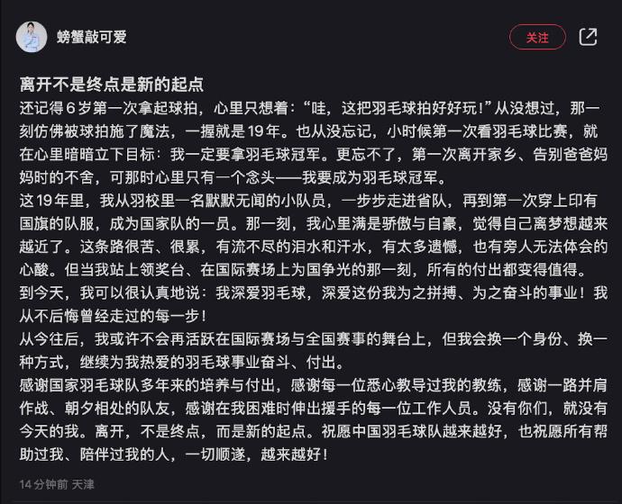 坑姝良社媒官宣退役,国羽这是咋了 昨天高昉洁和王正行先后宣布退役,没想到还有第3位,国羽女双球员坑姝良,是不是很陌生?是的,她现在还算小将,2004年出生,之前和张弛搭档。成绩不佳拆对,之后的成绩还是不行。不清楚为啥这么年轻就退役了。 一天之内3位球员退役,国羽这是怎么了?梯队建设是不是出了啥问题呢。感觉不太正常!不过,反过来想,竞技体育以成绩说话,打不出成绩就只能退役了。没办法,祝以后一切都好咯。