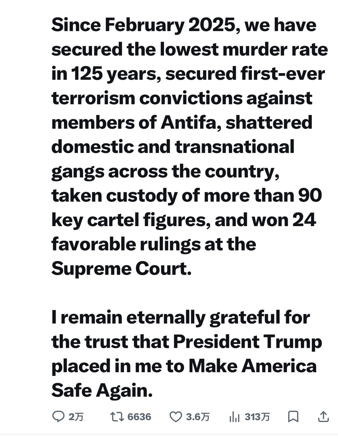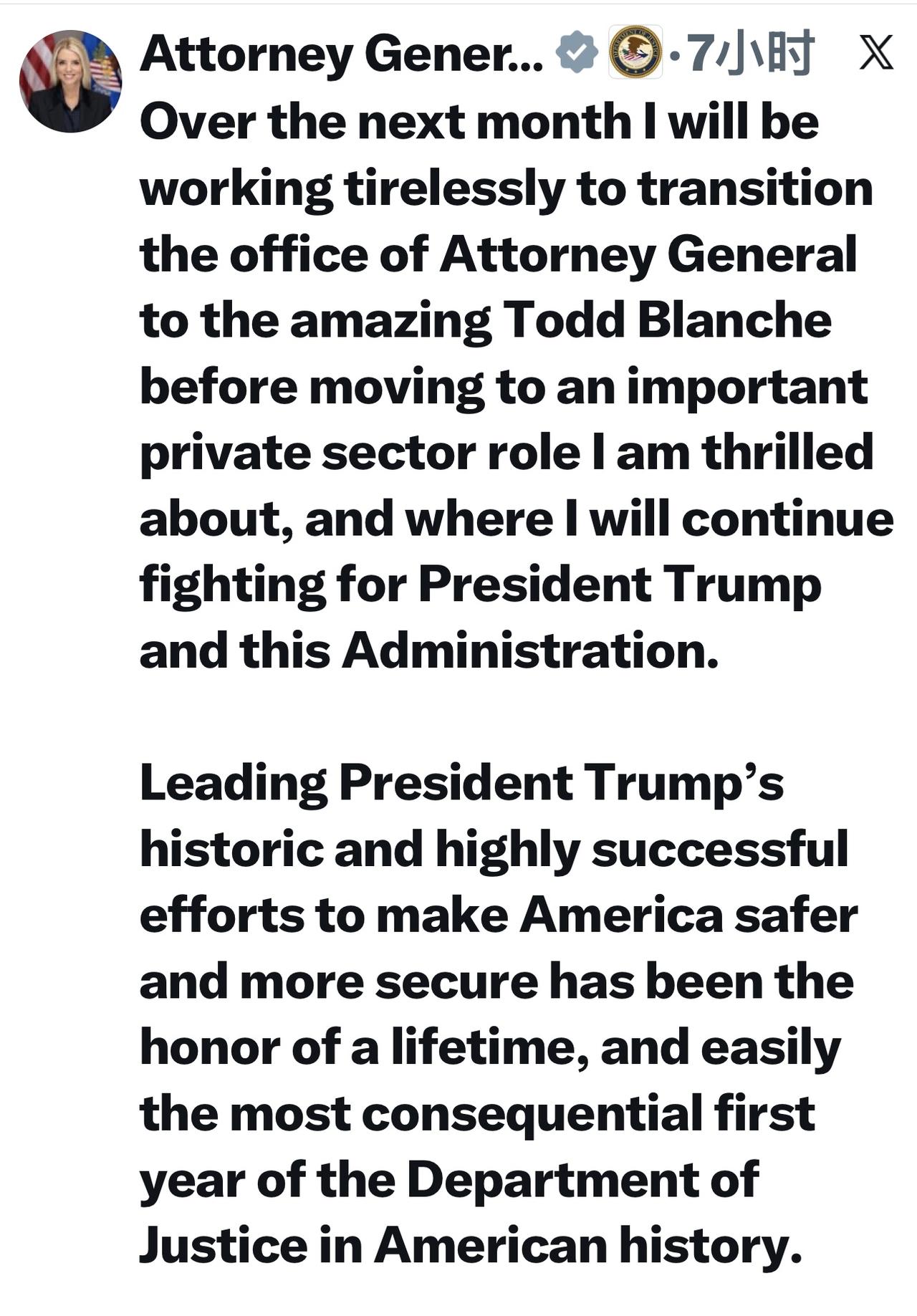 尽管被炒了鱿鱼,但还得装模装样表示感激 美国司法部长邦迪帖感谢川普: “接下来的一个月,我将不遗余力地将司法部长的职务顺利交接给优秀的托德·布兰奇,之后我将转任一个令我兴奋不已的重要私营部门职位,在那里我将继续为特朗普总统和本届政府而奋斗。 领导特朗普总统为使美国更加安全而做出的历史性且非常成功的努力,是我毕生的荣幸,也是美国司法部历史上最具影响力的第一年。 自 2025 年 2 月以来,我们取得了 125 年来最低的谋杀率,首次对反法西斯主义者成员进行了恐怖主义定罪,摧毁了全国各地的国内和跨国犯罪团伙,拘留了 90 多名重要的贩毒集团成员,并在最高法院赢得了 24 项有利的裁决。 我将永远感激特朗普总统对我的信任,让我有机会让美国再次安全。”