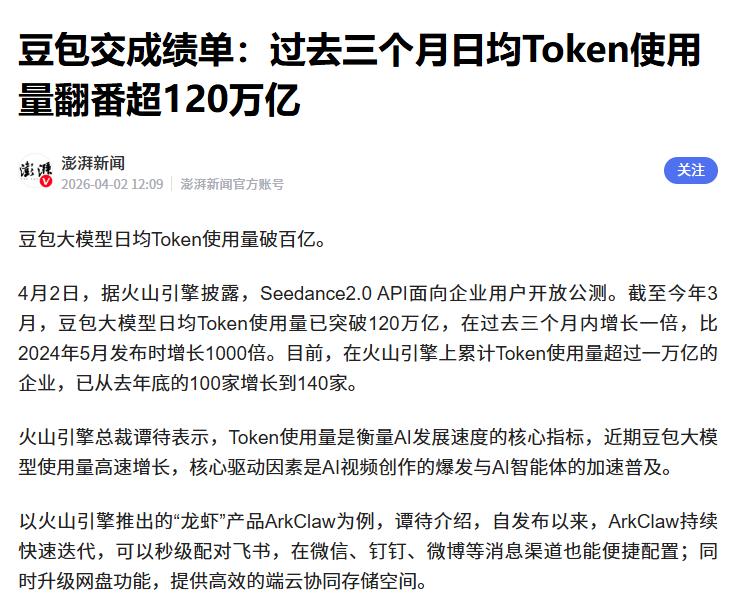 曝豆包日均token使用量超120万亿 据媒体报道,截止到2026年3月,豆包大模型的日均token使用量已经突破了120万亿大关,较比2024年5月刚刚发布时暴增了1000倍。 显而易见的是,随着token使用量的飙升,豆包在用户之间的传播度、使用率也均呈向好趋势。
