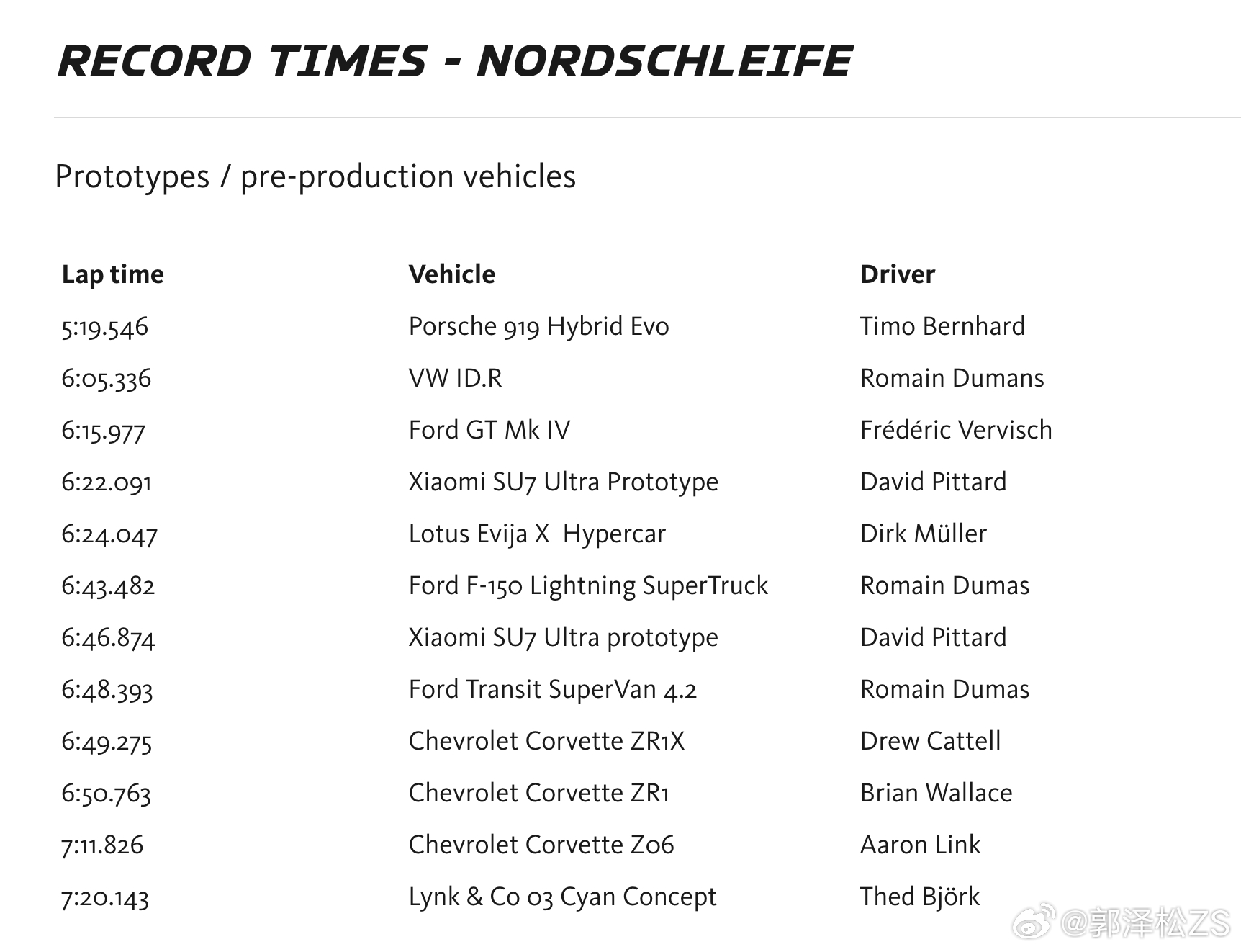 纽北军备竞赛又又又开始了,福特GT Mk IV创造了6分15.977秒,总榜第三,纯燃油第一作为该系列车型中最极致、仅限赛道使用的版本。Mk IV 采用定制的碳纤维 Multimatic 底盘,拥有更长的轴距、长尾车身和增强的空气动力学设计,可在时速 150 英里时产生超过 2400 磅的下压力。 3.8升双涡轮增压EcoBoost V6发动机,最大功率超过820马力。售价约为170万美元。去年8月开放了剩余少量预订。