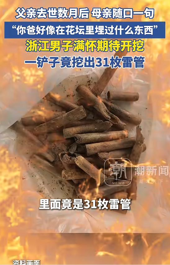 “万万没想到!”近日,浙江天台,一男子父亲去世数月后,母亲随口一句:“你爸好像在花坛里埋过东西”,让男子瞬间好奇,没想到挖开后,发现里面竟然是31枚雷管!这把男子吓坏了,赶紧拿着这些雷管来到派出所!网友:真吓人啊! 齐先生的父亲年轻时,恰逢当地搞基础设施建设,大规模的公路修建、山体隧道挖掘工程接连展开。 老爷子凭借着吃苦耐劳的劲头,加入了爆破施工队伍,成了队里不可或缺的骨干力量。 那些年,他跟着队伍辗转各个工地,钻山洞、装炸药、操作爆破设备,每一项工作都充满了风险,却从来没有出过一次差错。 按照如今的规定,雷管、炸药这类爆破器材,必须由专人负责看管、登记,施工结束后剩余的器材,必须统一上交,绝不允许个人私自留存。 但在当时,很多老工人都有个习惯,会悄悄留下几样“备用”的工具或器材,觉得说不定以后维修、应急能用上。 齐先生的父亲也不例外,只是他从来没跟家里人提过这件事。 老爷子性格本就内敛,不擅长跟儿女倾诉自己的过往,关于年轻时爆破施工的细节,他很少主动说起,更别提自己私藏了爆破器材的事。 就连齐先生的母亲,也只记得丈夫年轻时好像有过一些“干活用的零碎物件”,至于具体是什么、放在哪里,她一无所知,也从未多问。 几个月前,老爷子因病去世,一家人沉浸在巨大的悲痛之中,忙着处理后事、整理老人的遗物,满心都是不舍。 随着时间慢慢推移,一家人的生活也慢慢回到了正轨,齐先生只要一有空,就会回家陪伴母亲,陪她说说心里话,帮她排解孤独。 那天,齐先生像往常一样回家看望母亲,两人坐在院子里的长椅上,晒着太阳,有一搭没一搭地聊着老爷子生前的一些小事。 聊着聊着,母亲突然顿了顿,眼神里满是怀念,轻声说道:“你爸这人啊,什么事都喜欢藏在心里,不跟我们说。我忽然记起来,好多年前啊,他好像在院子的花坛里,埋过些什么东西。” 齐先生听到母亲这么说,觉得父亲已经不在了,花坛里埋的东西,说不定就是父亲生前珍藏的小物件,或许是他年轻时用过的工具,或许是一些有纪念意义的老东西。 这么一想,齐先生再也按捺不住,立马站起身,从家里找了一把小铲子,打算把父亲当年埋的东西挖出来,留作一份念想。 院子里的花坛不大,齐先生全程都格外小心,拿着小铲子一点点地翻找、挖掘。 铲子突然碰到了一个东西,齐先生心里一阵欢喜,心想总算找到了。 他立刻停下手中的铲子,一点点把表面的浮土清理干净。 齐先生凑近了仔细端详,越看心里越发慌,这东西不是别的,正是威力巨大的雷管! 他定了好一会儿神,才勉强缓过劲来,心里只有一个念头:太危险了,必须赶紧把这些东西送走,绝对不能留在家里。 他把那些雷管挖出来并用袋子装好后,来不及跟母亲详细解释,只匆匆说了一句“妈,我去趟派出所,有紧急的事”,就急匆匆地冲出了家门。 赶到派出所后,值班民警看到齐先生神色慌张、匆匆忙忙的样子,立刻上前询问情况。 齐先生喘着粗气,把手里的袋子递过去,一脸焦急地对民警说道:“警察同志,我在我家院子的花坛里,挖出来了雷管,是我父亲生前埋在那里的,我实在不知道该怎么处理,就赶紧送过来了。” 听到“雷管”两个字,值班民警瞬间提高了警惕,立刻疏散了周围的无关人员,随后戴上专业的防护装备,小心翼翼地打开袋子进行检查。 经过民警的仔细清点,确认袋子里一共有31枚雷管,虽然雷管已经出现锈蚀,但依然具有不小的危险性。 随后,这31枚雷管由公安机关按照规定,进行了专业妥善的处置。 (信息来源:潮新闻《父亲去世数月后,母亲随口一句话:“你爸好像在楼下花坛埋过什么东西”,浙江男子竟挖出31枚雷管。》)