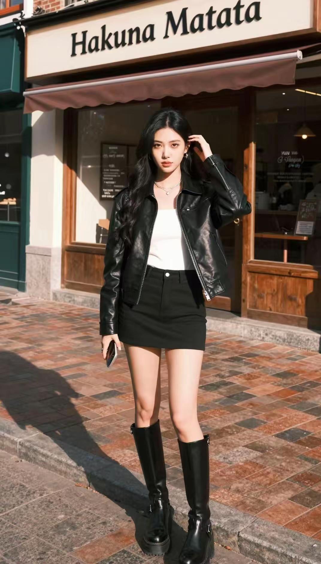 这套是优雅贵气黑白风,核心是黑色大衣+白衬衫+缎面半裙的搭配:宽松大衣自带松弛贵