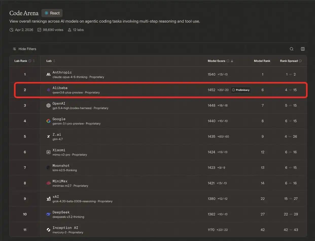 阿里千问Qwen3.6-Plus杀疯全球编程榜单!国产AI上演逆袭战🔥 今天科技圈沸腾了!阿里最新大模型Qwen3.6-Plus在全球最权威的AI编程盲测榜Code Arena狂飙登顶,力压OpenAI、Google等国际巨头,成为中国最强编程AI!这波操作堪称国产技术逆袭的“高光时刻”✨ 亮点直击: 1、全球第二,国产第一:在Code ArenaReact专项榜单中,Qwen3.6-Plus以1452分排名全球第二,超越GPT-5.0-High(1448分)和Gemini 3.1 Pro Preview(1440分),登顶国产模型榜首。 2、参数少,性能爆表:参数量仅为竞品1/2甚至1/3,却在HumanEval、MBPP等国际编程评测中碾压GLM-5、Kimi-K2.5,代码生成准确率、任务执行成功率较上一代猛涨47%。 3、真·“代码战神”:不同于普通AI补全工具,Qwen3.6-Plus能独立完成从项目初始化到调试运行的全流程开发,堪称“全能程序员”。 为啥这么牛? ✅ 原生多模态+超强推理:天生懂图文、代码多模态信息,复杂逻辑秒理解。 ✅ Agent能力狂飙:自主拆解任务、调用工具、调试bug,从“辅助工具”进化为“开发队友”。 ✅ 技术降维打击:用更少参数跑出更强性能,打破“参数即正义”神话,效率拉满。 行业震撼: ● 专家:这标志着国产大模型在垂直专业能力上实现历史性反超,AI编程从“追赶”到“领跑”! ● 开发者:终于有靠谱国产替代,再也不用被国外模型“卡脖子”了! 未来可期:Qwen3.6系列后续将开源更多版本,更强旗舰版Qwen3.6-Max已在路上。阿里这波技术突围,不仅为国产AI正名,更让全球看到中国智造的硬实力💪! 信息来源:钱江晚报 时间:2026年4月3日 ;国产大模型突破 编程AI登顶 Qwen3.6封神 技术逆袭