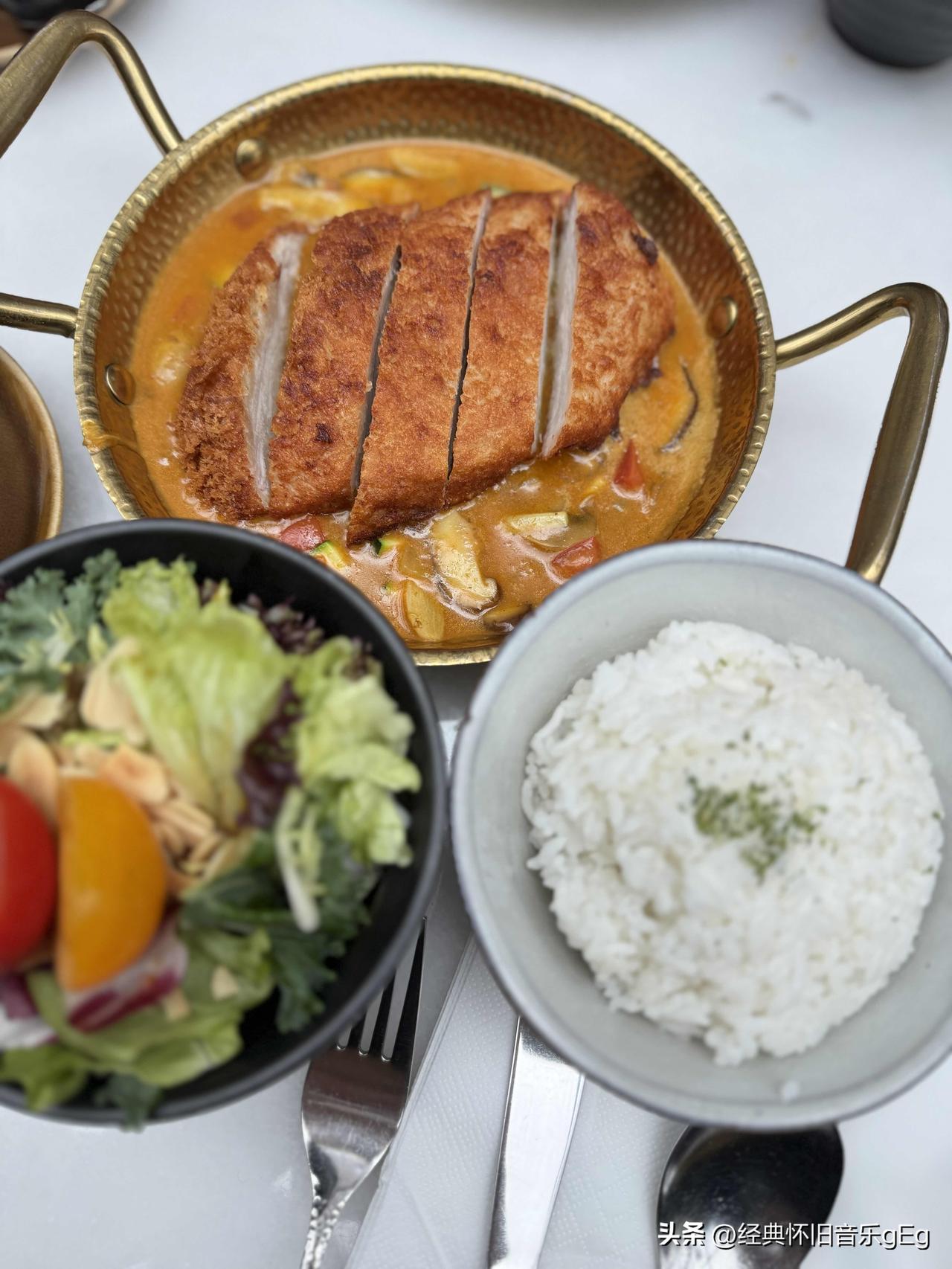 女儿贴心安排的午餐超合胃口,我的咖喱猪排饭香到舔盘,先生的米线配咖啡也很绝,搭配清爽沙拉,春日干饭仪式感拉满!