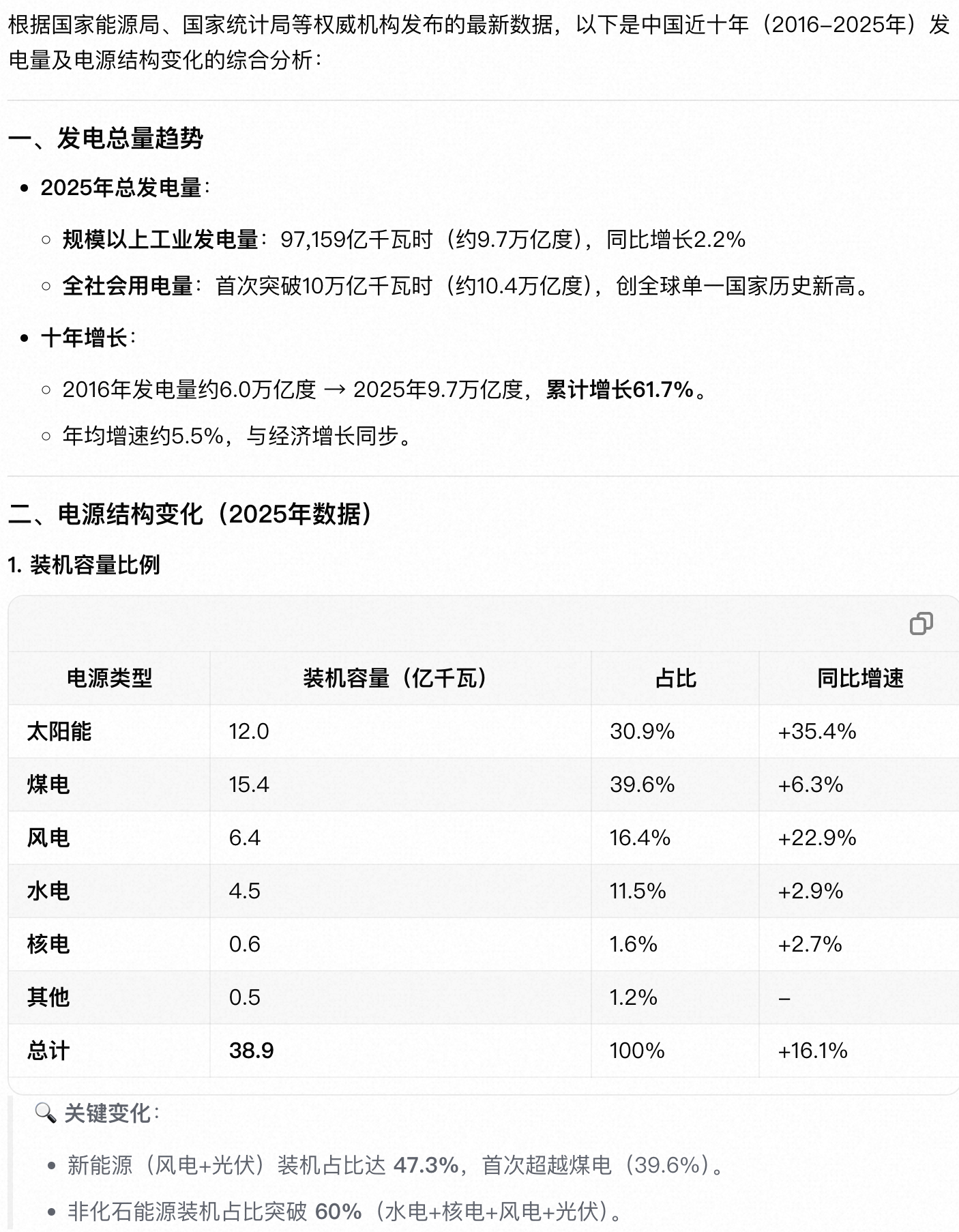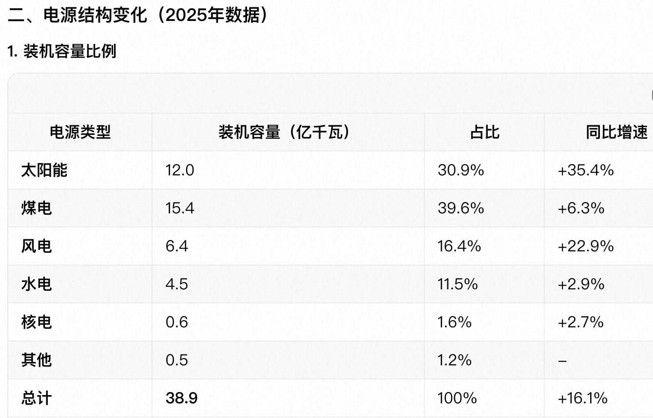 1、发电量相比十年前增加60%;2、新能源装机量接近50%,超过煤电,非化石能源装机量突破60%;3、光伏装机量是风电的两倍,但发电量只有风电的一半,光照确实不如风力稳定;3、煤电发电占比从70%降至65%,但煤电依然是主力,毕竟新能源的输出不够稳定;4、这里没提到的一点,其实煤电也更环保了,颗粒物和SO2等污染物的排放大幅下降,雾霾天很少见大家都看在眼里。