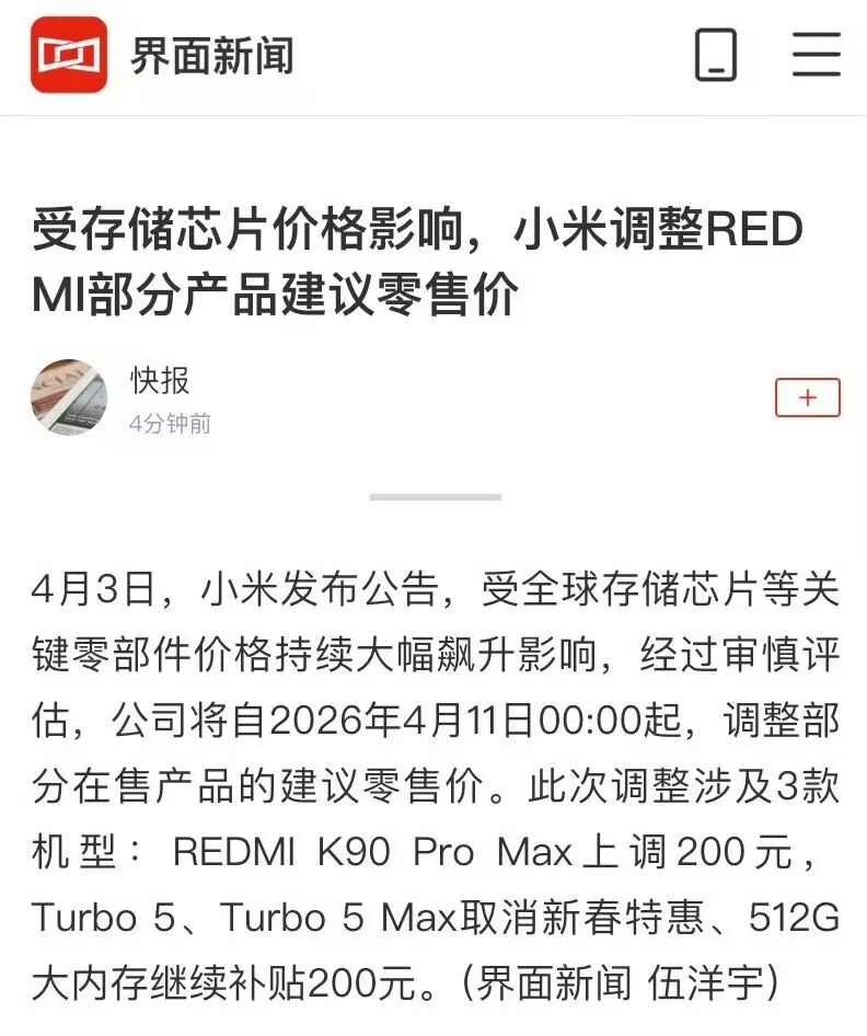 小米宣布调价小米4月11号起三款机型开始调价。K90 Pro Max涨200,Turbo5系列取消特惠,整体涨幅还算可以了,至少没把所有成本都转嫁给消费者。