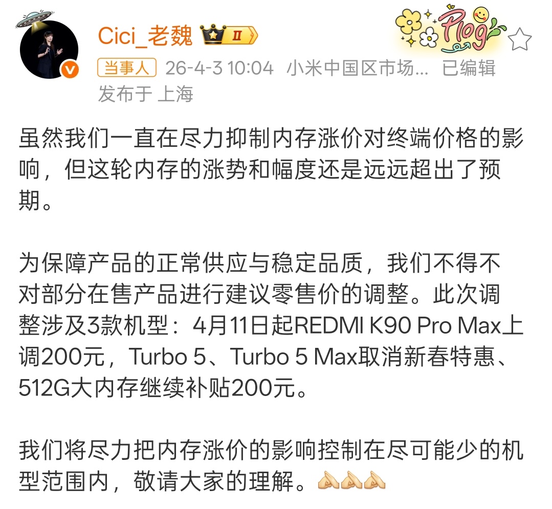 小米调价4月11日起REDMI K90 Pro Max上调200元,Turbo 5、Turbo 5 Max取消新春特惠、512G大内存继续补贴200元。