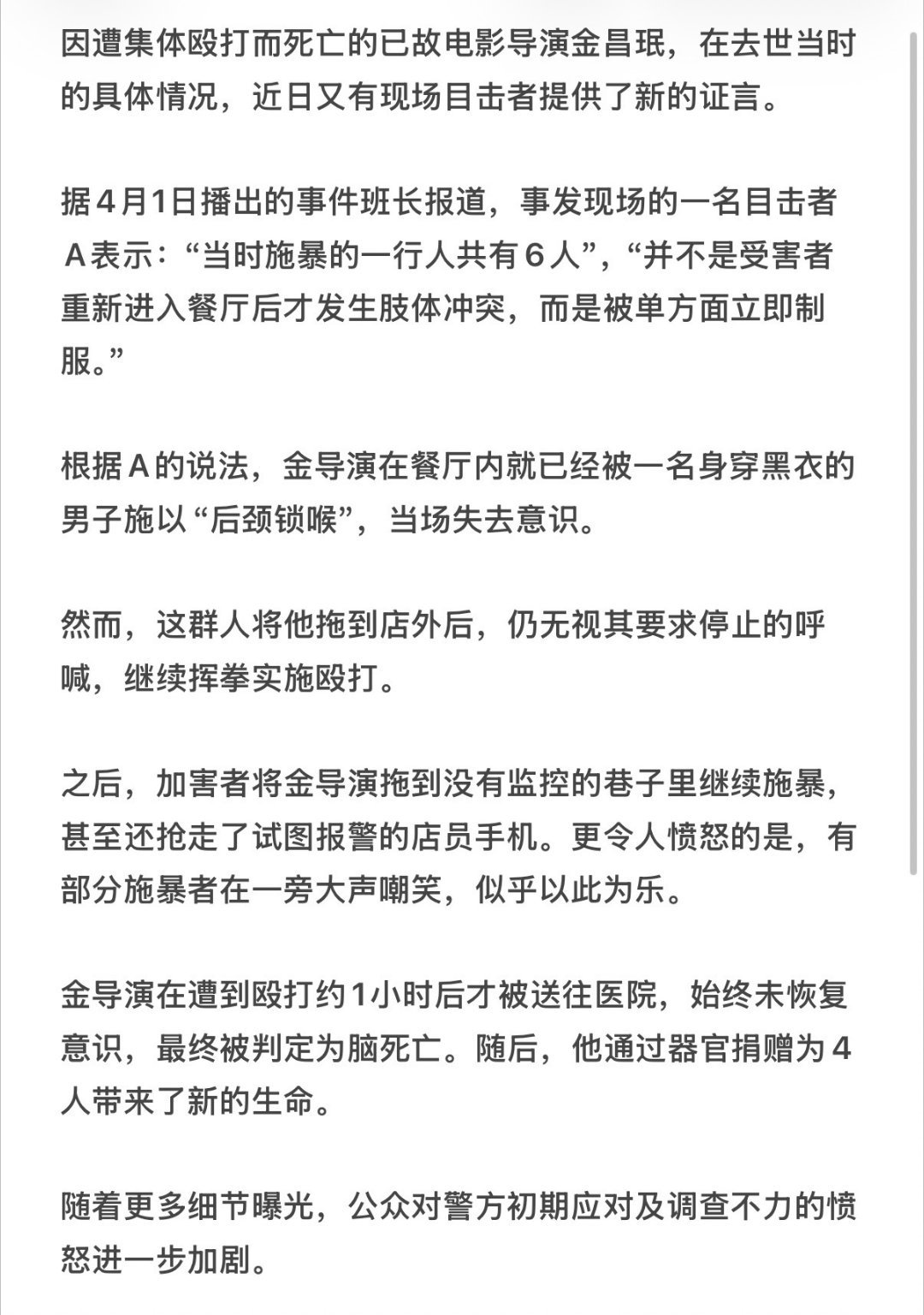 韩国导演被殴打身亡事件 据韩媒,已故韩国电影导演金昌珉遭6人围殴致死事件,有目击者提供新证言:金昌珉在餐厅内遭1名黑衣男子后颈锁喉当场失意识,后被拖至店外、无监控巷子被6人持续殴打,有部分施暴者甚至在一旁大声嘲笑,以此为乐。