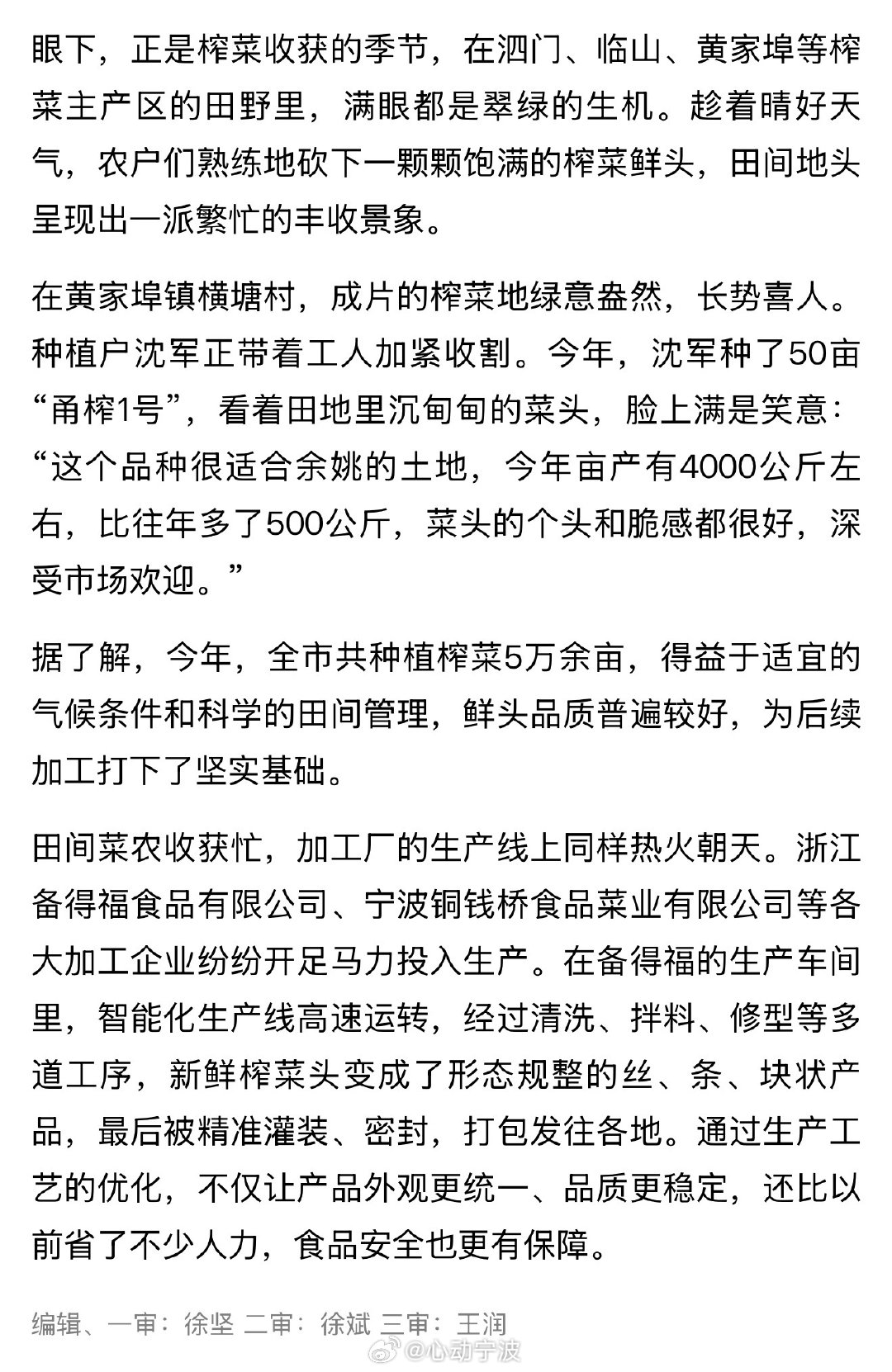 浙江余姚万亩榨菜喜获丰收助农增收 近日,余姚泗门、临山、黄家埠等榨菜主产区迎来收获旺季,田间地头一派繁忙丰收景象。今年余姚全市榨菜种植面积超5万亩,在适宜气候与科学管理下,榨菜品质优良。种植户种植的“甬榨1号”表现突出,亩产约4000公斤,较往年增产,菜头饱满脆嫩,市场认可度高。当地备得福、铜钱桥等企业同步开启加工生产,智能化生产线高效运转,经多道工序制成标准化产品并销往各地,既提升品质与效率,也保障食品安全,以产业发展助力乡村振兴。