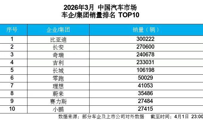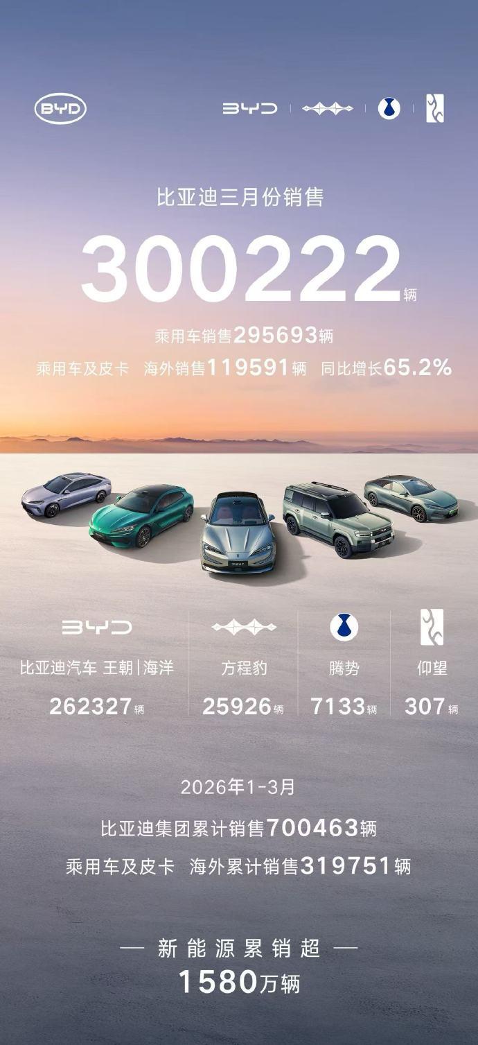 最近各大车企的3月销量都出来了,比亚迪是真的杀疯了,妥妥的断层领先!不管是吉利、奇瑞,还是鸿蒙智行、蔚来这些牌子,都没干过它。 3月份比亚迪直接卖了300222辆车,稳稳拿下中国车企单月销冠,更厉害的是,今年前三个月,它的新能源车一共卖了700463辆,一季度新能源销冠也被它收入囊中,这双冠王可是实打实的,一点水分没有。 它能卖这么好,说白了就是车够全,不管你想要啥样的都有。宋家族一个月快卖7万辆,元UP也卖了快2.4万辆,都是大街上常见的热门款。走硬派越野的方程豹,一个月也卖了2.5万多辆,比去年同期翻了两倍多。海外市场也超猛,3月就出口了快12万辆,涨得飞快。 能一直领先,关键还是技术硬。3月刚出的第二代刀片电池和闪充技术,充电速度贼快,彻底解决了大家充电慢的烦恼,智能驾驶也越来越普及。这么看来,比亚迪的双冠王真不是偶然,靠实力站稳了脚跟,也给整个新能源汽车行业树立了新标杆。