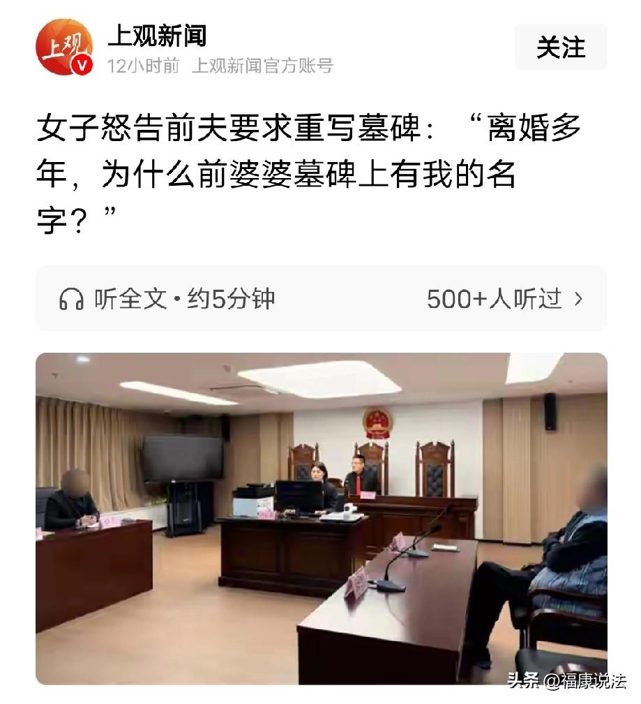 上海,女子离婚多年,偶然得知自己离婚后,名字被刻在前婆婆的墓碑上,竟是儿媳身份。女子无法接受,更气前夫不问自己一声就刻名,于是,她找前夫要求把墓碑上的名字去掉,没想到,前夫说:老人安葬20多年,不能惊扰逝者,双方僵持不下,闹到法院,结局让人唏嘘。 林女士偶然间得知了一个让她难以置信的消息,自己离婚多年,自己的名字竟然被刻在了前婆婆的墓碑上,身份还标着儿媳。 她难以接受,这件事简直成了她的心结,憋屈许久之后,她直接把前夫告上法庭,执意要抹去墓碑上自己的名字。 事情是这样的,上世纪70年代初,林女士就和前夫何先生结了婚,两个人一起过了快30年,算得上是老夫老妻,只是后来感情淡了,两人和平协议离婚。 离婚之后,两人就各过各的,很少再有来往,林女士也慢慢开启了自己的新生活,彻底走出了这段婚姻。 再后来,林女士听说前公婆相继去世,想着自己已经不是何家的人,就没去祭拜,也没多过问后事。 本以为日子能一直安稳过下去,可当林女士得知墓碑刻名一事,她瞬间怒火中烧,心里又堵又难受。 她怎么也想不通,两人都离婚这么多年了,早就不是一家人,自己早就没了“何家儿媳”这个身份,前夫凭什么不跟自己商量一下,就私自把名字刻在老人墓碑上? 每次想到这件事,她都觉得浑身不自在,总觉得别人会用异样的眼光看自己,连正常生活都受到了影响,心里的疙瘩越结越大。 她觉得,前夫这是不尊重自己,侵犯了自己的权利,让她平白无故多了没必要的困扰。 林女士实在忍不下去,一怒之下找到了前夫何先生,要求他把自己的名字从前婆婆的墓碑上去掉,还得赔偿自己精神损失费。 可何先生说什么都不同意。 何先生说出了他的理由:因为当年母亲和林女士婆媳关系特别好,就算离婚后,林女士也常来看望老人,刻上她的名字,是为了完成母亲的心愿。 而且老人已经安葬二十多年了,动墓碑就是惊扰逝者,他实在不忍心,也不想因为这事惹得其他家人不满。 两边各有各的道理,一个非要除名,一个坚决不肯,事情彻底僵住了。 无奈之下,林女士只能将何先生起诉到法院。 其实,这事林女士别扭可以理解,离婚后,老人才去世,但是何先生不告知一声,就把林女士的名字刻上前婆婆墓碑上,确实不妥。 这就好比一段早就结束的关系,硬生生被人钉在墓碑上,甩都甩不掉。 往后不管是自己去扫墓,还是家里人、朋友问起来,就会特别尴尬,心里肯定堵得慌。 林女士不是小题大做,前夫都没有提前问她一声,跟她商量一下,让她觉得自己的身份没被尊重。 而且,离婚后,她想好好的生活,却被过去的一段旧关系绊住了,精神上肯定受困扰,她想把名字去掉,就是想图个清净,回归自己现在的生活,不想再和前夫家有这种扯不清的牵扯。 从法律方面,林女士有权要求前夫去掉墓碑上的名字吗? 何先生基于孝道和老人遗愿刻名,初衷是成全过往。 但在法律视角下,林女士的姓名属于她个人的人格权。 《民法典》第1012条规定:自然人享有姓名权,有权依法决定、使用、变更或者许可他人使用自己的姓名。 非本人授权或因法定关系(如婚姻、血缘),他人无权擅自将其作为“家属”标记在墓碑上。 随着二人离婚生效,林女士在法律上已不再具有“儿媳”这一身份,前婆婆墓碑刻其名既违背了客观事实,也侵害了她对自身姓名的控制权。 所以,前夫不能擅自将林女士的名字刻在母亲墓碑上。 因为,祭奠权主要保护的是近亲属对逝者的哀悼利益,通常包括在墓碑上署名的权利。 然而,这种权利仅限于具有法定亲属关系的人员。 但林女士与何先生离婚后,双方的法律姻亲关系已经解除,她对前公婆不再享有法定的祭奠权。 反之,何先生也不再享有在前妻不知情的情况下,将其作为家庭成员“署名”的处分权。 经过法院调解,二人有所缓和。 林女士表示,只要把名字去掉,可以少要一点精神损失费。 何先生表示,会做通其他家属的工作,把林女士名字去掉,也愿意给她补偿。 最终,达成调解方案,何先生在一个月内去除墓碑上林女士的名字,为表达歉意,他自愿补偿林女士。