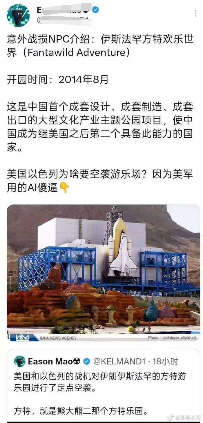 儿童主题乐园里的飞机也炸伊朗伊斯法罕省副省长表示,美以战机侵犯当地领空,对“伊斯法罕方特欢乐世界”这座儿童游乐场发动了袭击,此次袭击是“针对儿童游乐场所的野蛮行为”,是“杀害儿童的敌人犯下的又一罪行”。但更多网友怀疑,是因为乐园里有图一设施,才被轰炸。伊斯法罕方特欢乐世界是深圳企业华强方特在海外的首个主题公园项目,位于伊朗伊斯法罕市,于2014年8月开园。该乐园由伊朗伊斯法罕市政府投资建设,总投资约600亿伊朗里亚尔(当时约合数亿美元)。 华强方特主要负责概念设计、总体规划、建筑设计、全套游乐设备和影片出口,以及后期的运营指导和技术支持。伊朗最大岛屿遭美以袭击特朗普放炸桥视频施压伊朗