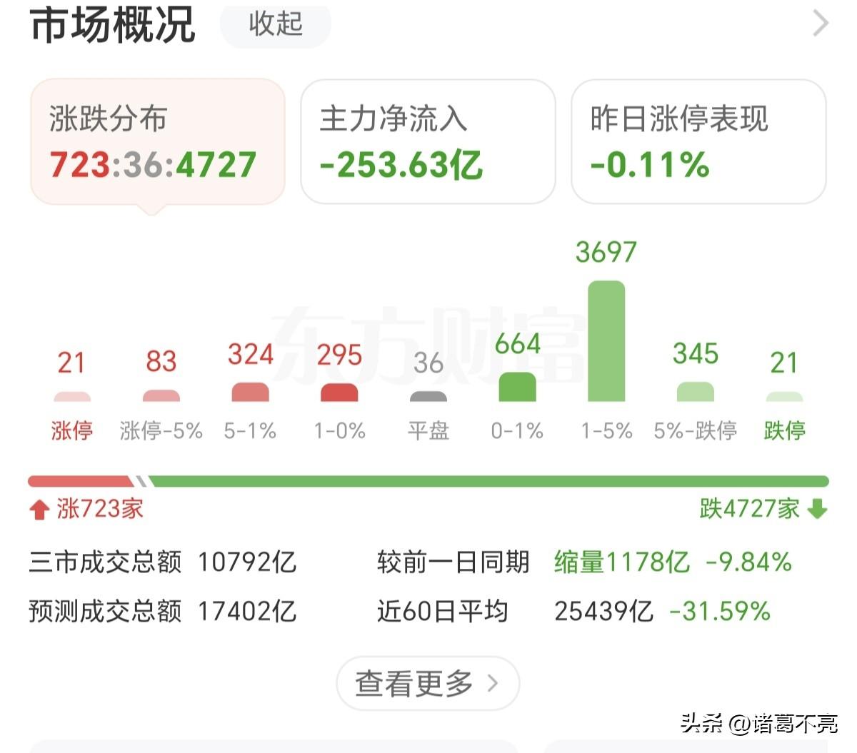 又是普跌的一天,量能缩到这种程度要想起来也很难,毕竟马上面临小假期谁也不知道出什么幺蛾子。 资金趋于谨慎,在5分钟走势上看样子要走9浪下跌结构了,照这样子,尾盘可能杀跌一波,要做好这种准备吧。 市场量能分析