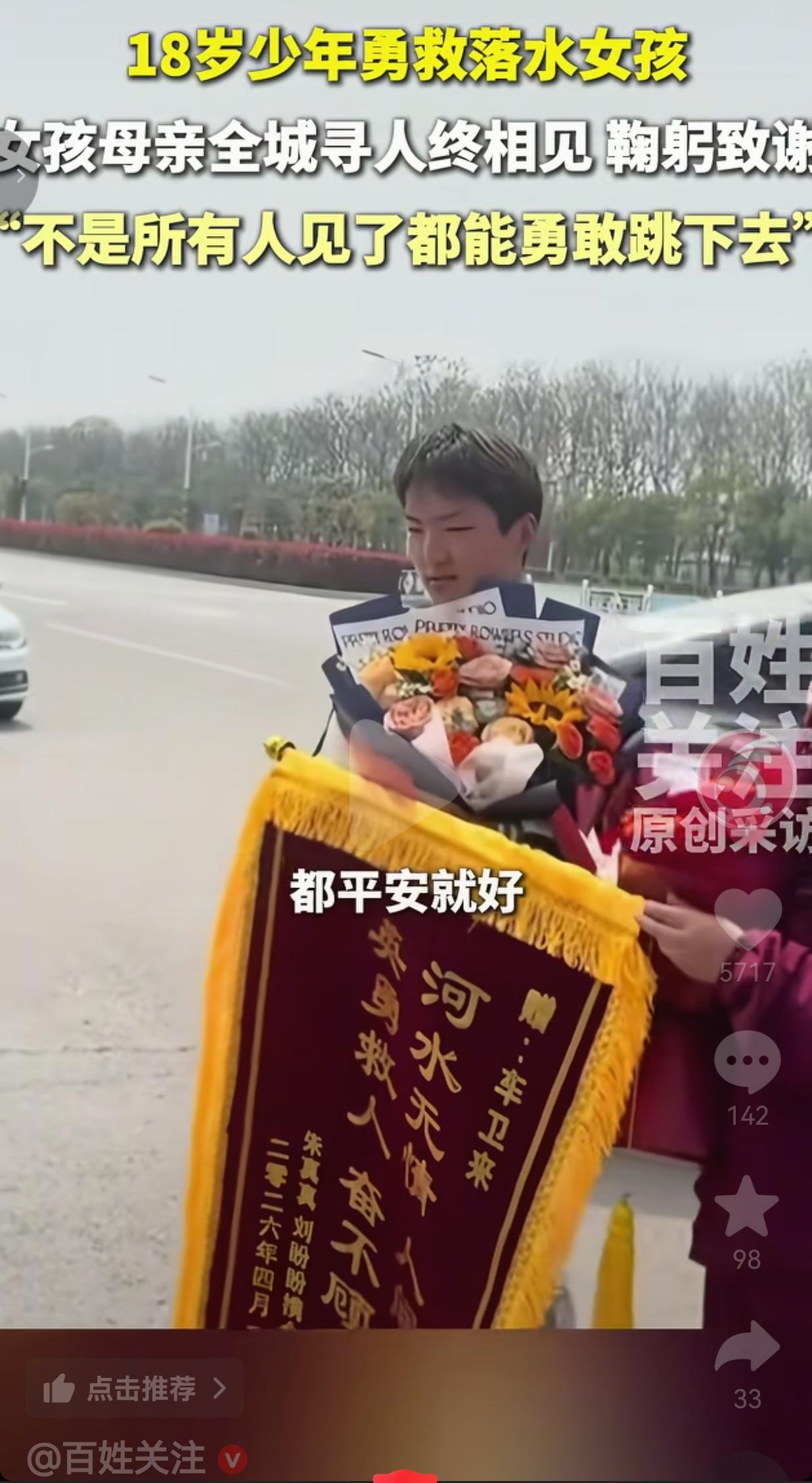 破防了!18岁的年纪,本该是被人护着的年纪,他却一头扎进冰冷的河水里,用自己的命去换一个素不相识的小女孩的命! 安徽亳州蒙城县,4月2日那天,一个小女孩在河边玩耍,一个没站稳直接掉进了河里。河水冰冷,孩子在水里拼命扑腾,眼看着就要沉下去,周围的人都慌了神,没人敢贸然下水。 就在这千钧一发的时刻,一个18岁的少年冲了过来,连一秒钟的犹豫都没有,直接纵身跳进了河里! 他拼尽全力游到女孩身边,用尽全力把女孩往岸边推,岸上的人赶紧伸手把女孩拉了上来,孩子捡回了一条命,而少年自己也浑身湿透、冻得发抖,却在确认女孩没事后,默默转身离开了现场,连名字都没留。 女孩的妈妈朱女士,看着死里逃生的女儿,心里又后怕又感激。她知道,要是没有这个素不相识的少年,自己的孩子就没了。 她拿着监控里模糊的画面,在城里到处打听,发了无数条求助信息,就为了找到这个救命恩人,当面说一声谢谢。 功夫不负有心人,仅仅半天时间,朱女士就找到了这个18岁的少年车卫来。 见面那天,朱女士带着女儿,捧着鲜花、拿着锦旗、塞着红包,对着少年深深鞠了一躬,眼泪止不住地流:“不是所有人见了都能勇敢跳下去的,你才18岁,也是个孩子啊!谢谢你救了我女儿的命!”她还让女儿给哥哥鞠躬,一遍遍地告诉孩子,要永远记住这份恩情。 少年车卫来只是腼腆地笑着,说自己只是做了应该做的事,红包说什么都不肯收,只说“都平安就好”。 网友评论炸锅了,全是破防的声音! 有的网友说:“18岁!这才是我们该追的星!那些天天上热搜的流量明星,有几个能有这勇气?这才是我们身边真正的少年英雄!” 有一位蒙城老乡说:“我就是蒙城人!为这个小伙子骄傲!这才是咱安徽人的骨气!阿姨也太懂感恩了,全城寻人这波,真的让人心里暖!” 还有的网友说:“看哭了!我也是妈妈,太懂这种失而复得的心情了!换我我也得全城找恩人!这孩子才18岁,太勇敢了,父母教得太好了!” 也有的网友说:“不是谁都有勇气跳下去的!多少人站在岸边犹豫,多少人拿起手机拍照,只有这个孩子,想都没想就冲了上去!这才是刻在骨子里的善良!” 现在网上总有人说,现在的年轻人自私、冷漠,可这个18岁的少年,用行动狠狠打了那些人的脸! 他才18岁啊,自己都还是一个孩子,却在别人生死关头,没有丝毫犹豫,用自己的安危去换别人的生命。这不是一时冲动,这是刻在骨子里的善良,是刻在骨子里的担当! 我最感动的,除了少年的勇敢,还有女孩妈妈的感恩。她没有因为孩子救回来就不了了之,而是拼尽全力全城寻人,只为了当面说一声谢谢,给孩子一个交代,给这份善意一个回应。 这才是最珍贵的双向奔赴!善良遇见感恩,才是这个世界上最美好的事情! 现在太多人,把别人的善意当成理所当然,受了恩惠就消失得无影无踪。可这个妈妈,用行动告诉我们:滴水之恩,当涌泉相报!别人救了你的命,你就必须用一辈子去铭记,去感恩! 我真的太爱这种人间烟火气里的温暖了!没有惊天动地的豪言壮语,只有一个少年的纵身一跃,一个母亲的全城寻找,一份双向的善良与感恩。这才是我们这个社会最该有的样子!   这个世界从来都不缺冷漠,缺的是像少年一样敢挺身而出的勇气,缺的是像妈妈一样懂感恩的真心。 善良从来都不是选择题,而是刻在骨子里的本能;感恩从来都不是客套,而是对善意最基本的尊重! 对此,你怎么看?