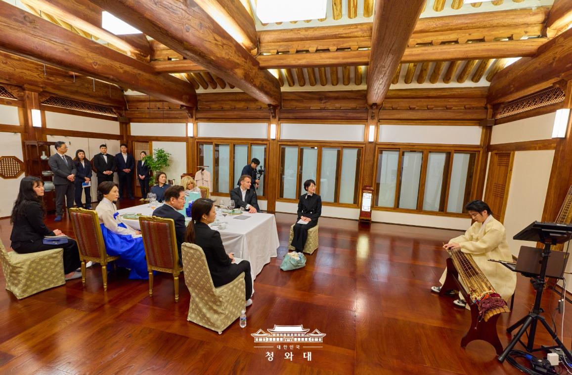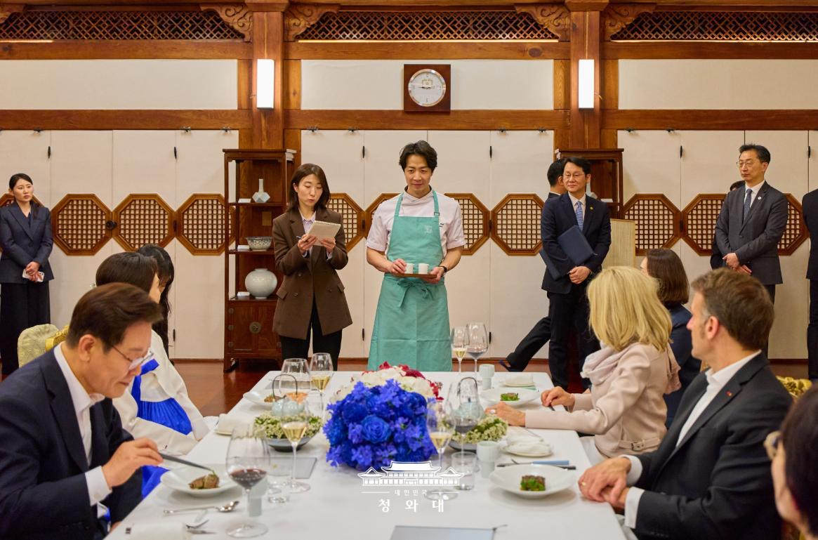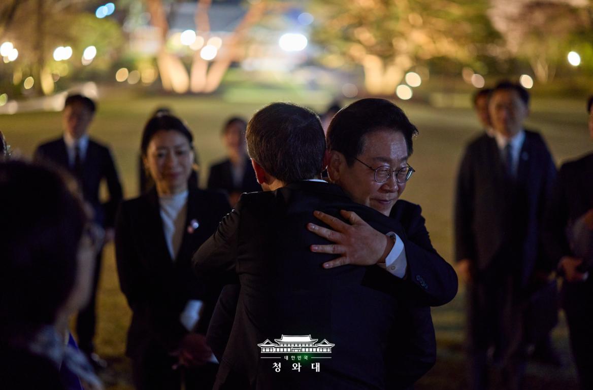 马克龙访韩国第一天见李在明,穿西服与白衬衫没有系领带,松弛感满满!4月2日法国总统从日本抵达韩国,到了韩国的马克龙并没有休息,而是去见了李在明。 由于是非正式见面,马克龙的着装很洒脱,白衬衫领口敞开着,没有拘束也不签协议,只是见面聊天吃饭;反观李在明也一样,穿西服不打领带很随意。 他们见面就像老友见面,简简单单的很是开心,就连第一夫人也一样,当天的布里吉特穿着风衣,还是抵达机场时的造型并没有换装,金惠景选择传统服饰很有辨识度,四个人在一起吃饭听音乐,好惬意呀!