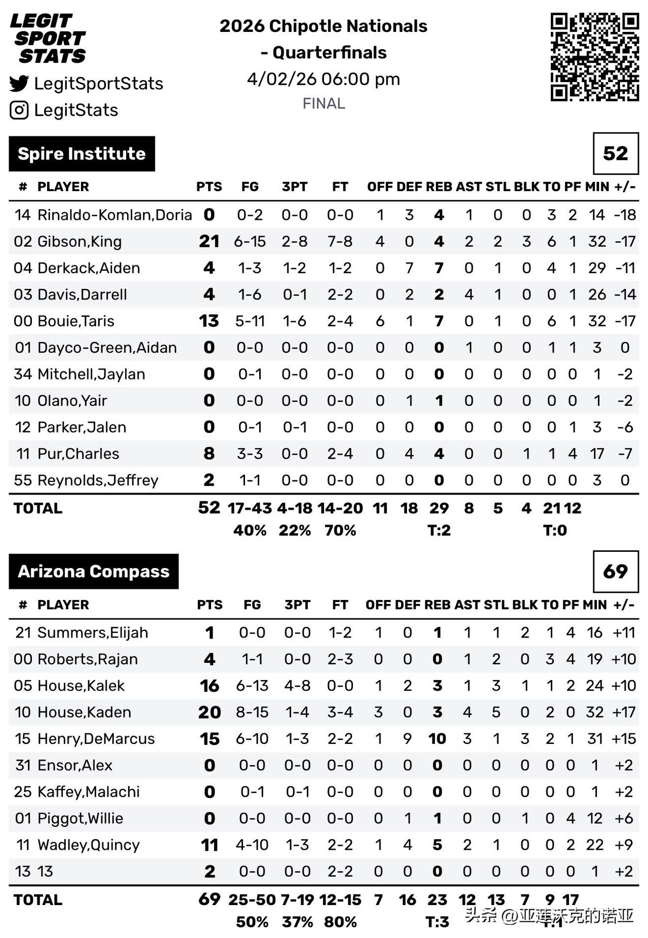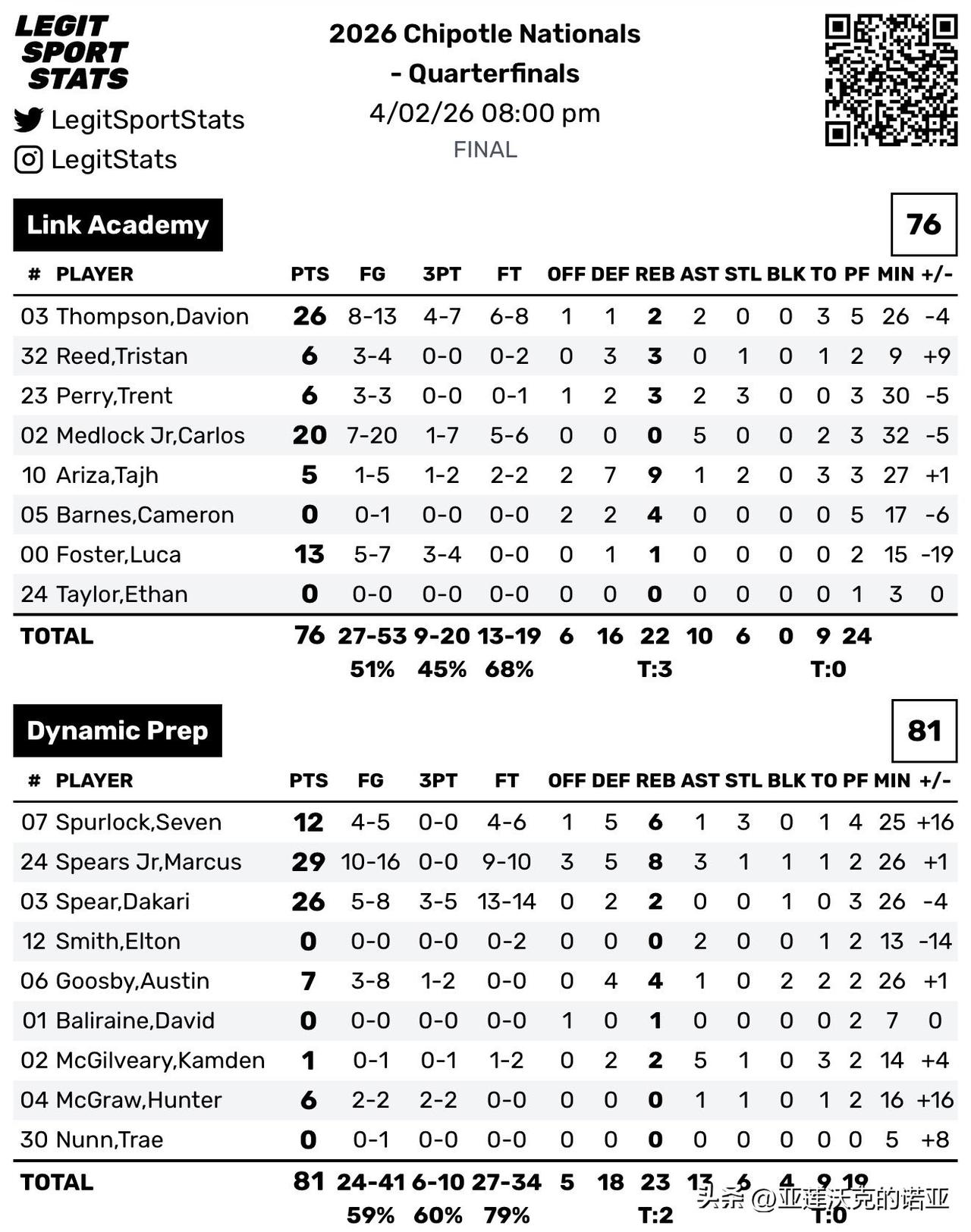 OTE冠军德州Dynamic Prep击败密苏里州Link Academy晋级四强,2027届招生 全美第一Marcus Spears Jr 29分8篮板 vs Davion Thompson 26分,2026届招生 德州理工Dakari Spear得到26分,马里兰后卫Kaden House单场20分5抢断4助攻帮助亚利桑那州AZ Compass Prep击败俄亥俄州Spire Academy。