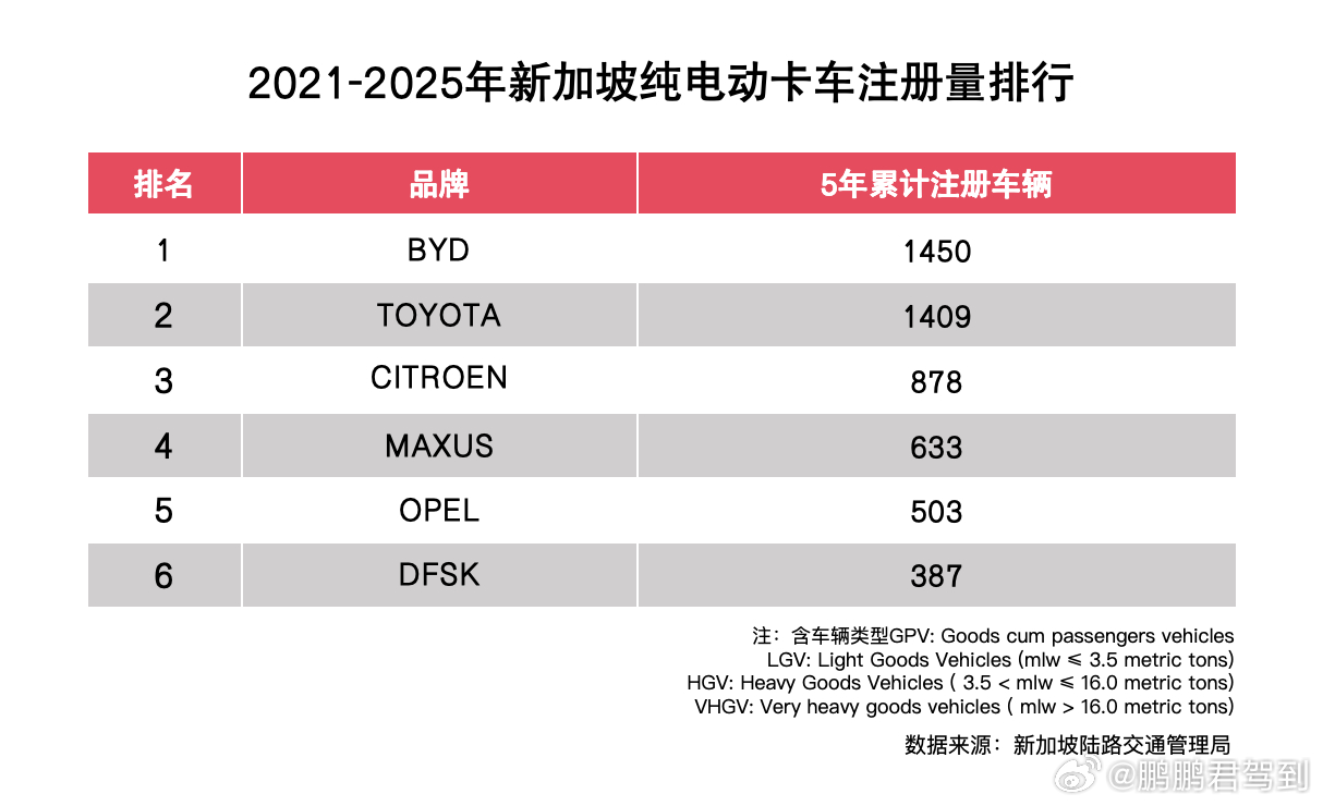 比亚迪包揽新加坡多项销量冠军,助力当地全面电动化!近期,据新加坡陆路交通管理局数据显示,2025年,比亚迪乘用车在新加坡销售11184辆,同比增长80.6%,蝉联年度全品牌销量冠军。自2022年,比亚迪正式进入新加坡乘用车市场,仅用两年时间成功登顶榜首。此外,在商用车领域,比亚迪电动巴士于2018年正式进入新加坡,订单已超500台,市占率超60%,稳居行业第一。另外在2021年-2025年,比亚迪纯电卡车在新加坡五年累计注册量达1450台,排行第一。新加坡市场对车辆安全、能耗、可靠性要求极其严苛,可以说是东南亚乃至全球市场的标杆。比亚迪包揽乘用车、商用车多项第一,离不开12年深耕,始终为市场提供领先的技术、可靠的产品及优质的服务。 目前在乘用车领域,比亚迪已布局ATTO 3、海豚、海豹、海狮等车型,豪华品牌腾势已布局D9、B5等车型,覆盖多个细分市场;在商用车领域,已形成电动巴士、重卡、小卡的产品布局。比亚迪以乘用车、商用车全场景解决方案,满足多元需求,用实力助力全球绿色出行。