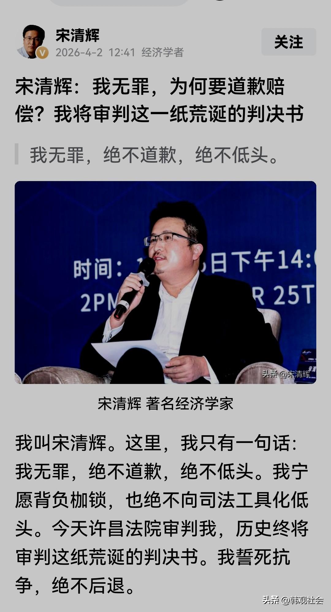 宋清辉说,他无罪,不低头,不道歉。不过,有罪无罪,老宋自己说了不算!而是法律说的算。 让老宋反感的还有,许昌法院二审开庭的日期,不应该选择在清明节之前。因为安排在这个日期开庭,让他想到了他的儿子宋昊然,已经离开他1591天…… 二审已经开过庭了,老宋这几天不停喊冤!如此看来,合议庭组成人员压力山大啊!就看下面是否能够改判?