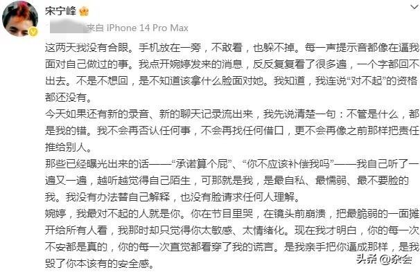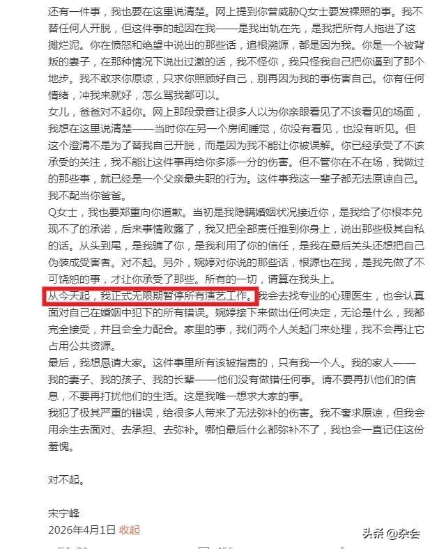发现没有,有些男人的认错,永远在给自己找台阶下。 宋宁峰承认出轨宣布退圈,看似掏心掏肺,字里行间却全是在撇清。特意强调女儿没在同一个房间,潜台词是“我没那么丧心病狂”。真正让人窒息的不是房间隔着一堵墙,而是你带着无辜的孩子去赴约!一句“不配当爸爸”式的自我贬低,不过是想用“我都这么骂自己了你们还想怎样”来堵住悠悠众口。这算盘打得,真响。