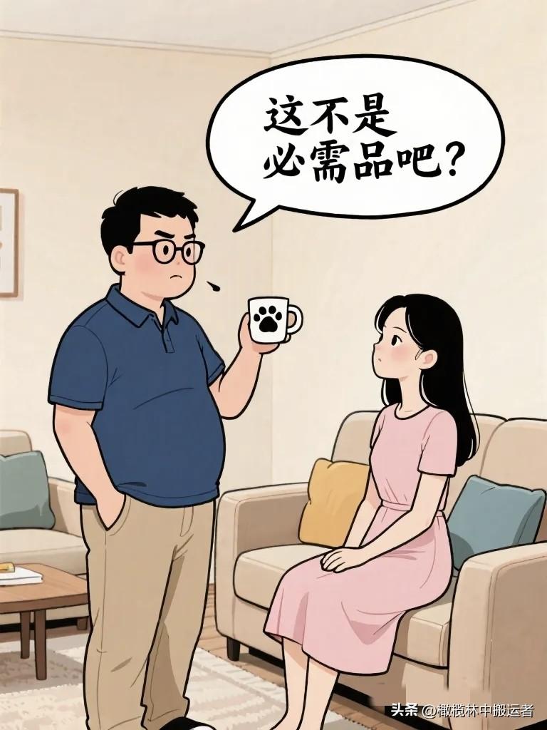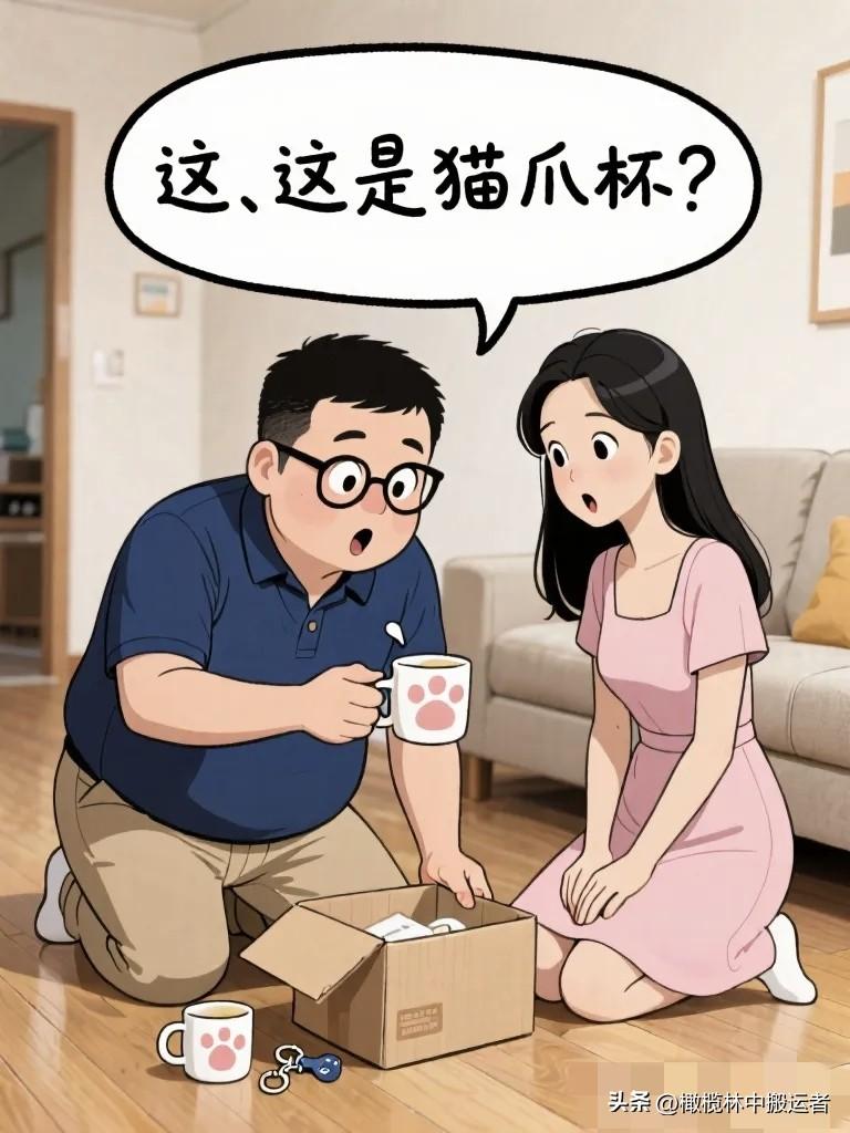 幽默漫画图:老公:你又买什么了,门口七八个快递。老婆:就一些生活必需品。老公拆开一看:猫爪杯、假睫毛、手机壳……漫画小趣味