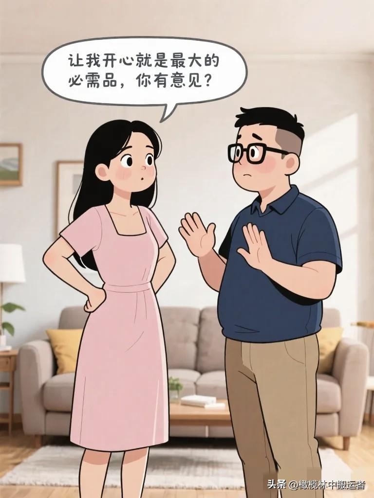 幽默漫画图:老公:你又买什么了,门口七八个快递。老婆:就一些生活必需品。老公拆开