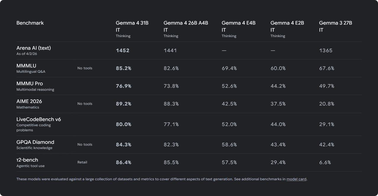 谷歌正式发布了Gemma 4系列: 1.包含 E2B、E4B、26B-A4B、31B,4 种不同应用场景的开源模型 2.这和Qwen3.5系列模型同台站榜,有点PK的意思。毕竟最近几个月Qwen3.5开源模型在世界范围内反响不错,结合qwen3.5系列的衍生模型也不断出现,引起全世界开源模型研究对象的广泛关注。 3.不同大厂在开源领域竞争角逐大模型影响力,这不是坏事。重要的是共同推进大模型的开源和提高大模型的能力,让大模型更好的服务人类。 4.我也要去下载研究一下看看3090显卡本地部署Gemma-4-31B稠密模型的效果如何,晚点说下感受和采集各方数据。