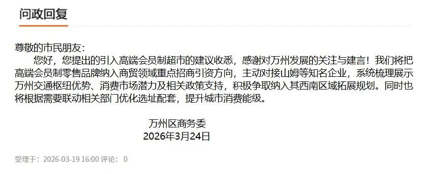 重庆万州山姆即将落地开建。 近日有当地的市民朋友们向万州区的相关领导留言,得到了官方的积极回应。重庆现在有两家山姆超市,第三家落地万州区域也是不错的,万州区人口多达一百七十余万,辖24个街道,潜力还是可以的,加之周边的人们也是更方便了!