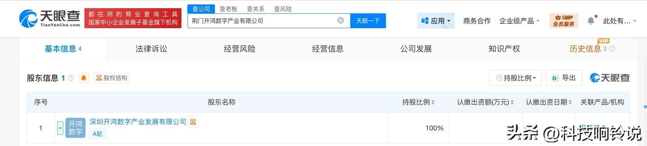 【深开鸿在荆门成立数字产业公司 注册资本500万】 天眼查工商信息显示,近日,荆门开鸿数字产业有限公司成立,法定代表人为王波,注册资本500万人民币,经营范围包括信息系统集成服务、软件开发、物联网技术研发、人工智能行业应用系统集成服务等。股东信息显示,该公司由深圳开鸿数字产业发展有限公司全资持股。 天眼查信息: