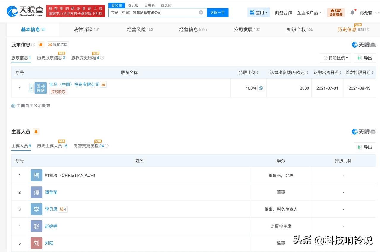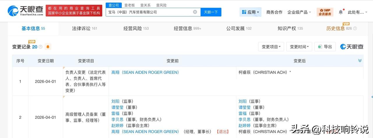 【高翔卸任宝马中国公司董事长 宝马中国公司换帅】 天眼查工商信息显示,近日,宝马中国关联公司宝马(中国)汽车贸易有限公司发生工商变更,高翔(SEAN AIDEN ROGER GREEN)卸任法定代表人、董事长及经理,由柯睿辰(CHRISTIAN ACH)接任。 宝马(中国)汽车贸易有限公司成立于2005年9月,注册资本2500万欧元,经营范围包括作为宝马集团BMW、MINI和Rolls-Royce品牌进口汽车在国内的总经销商等。股东信息显示,该公司由宝马(中国)投资有限公司全资持股。 据媒体报道,此前,宝马集团官方宣布一则高层人事变动公告,自2026年5月1日起,宝马集团大中华区总裁兼首席执行官高翔将出任MINI美洲区副总裁,而高翔在华超过12年的任职将由柯睿辰(Christian Ach)接棒。 天眼查信息: