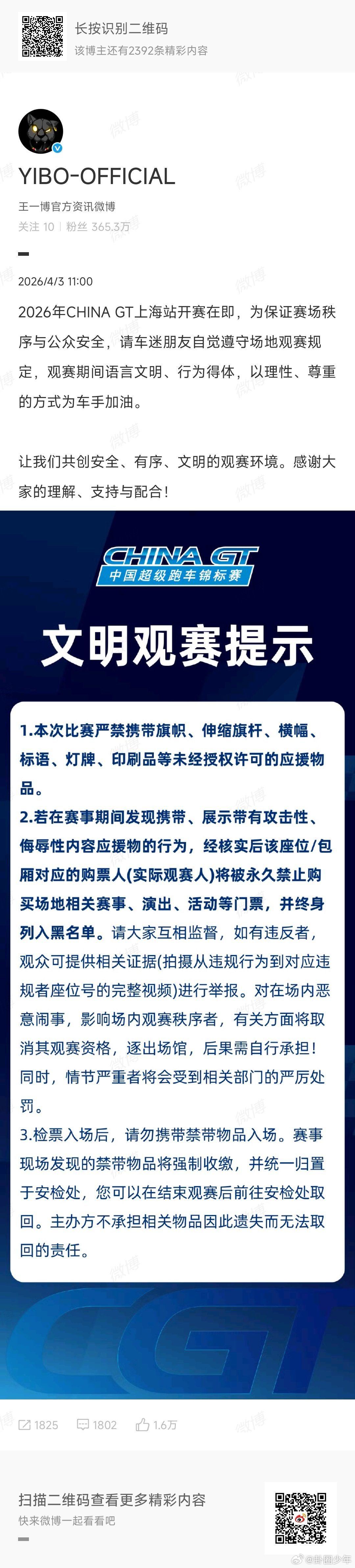 王一博呼吁遵守场地观赛规定王一博请车迷朋友遵守观赛规定 王一博请车迷朋友遵守观赛规定,热爱有度,文明观赛。请各位车迷朋友自觉遵守赛场规定,听从现场指引,理性助威、保持秩序,共同守护安全纯粹的赛事氛围。