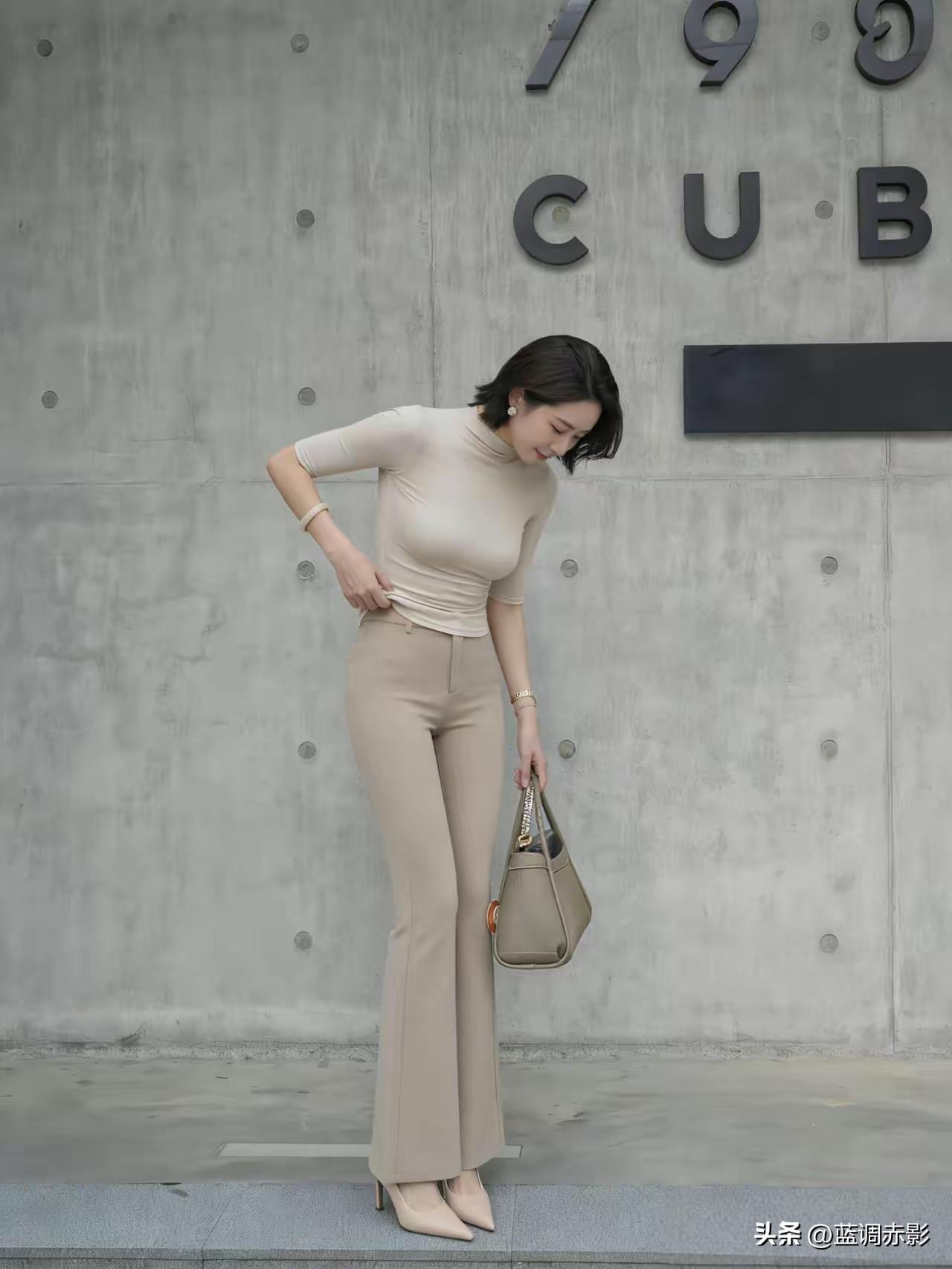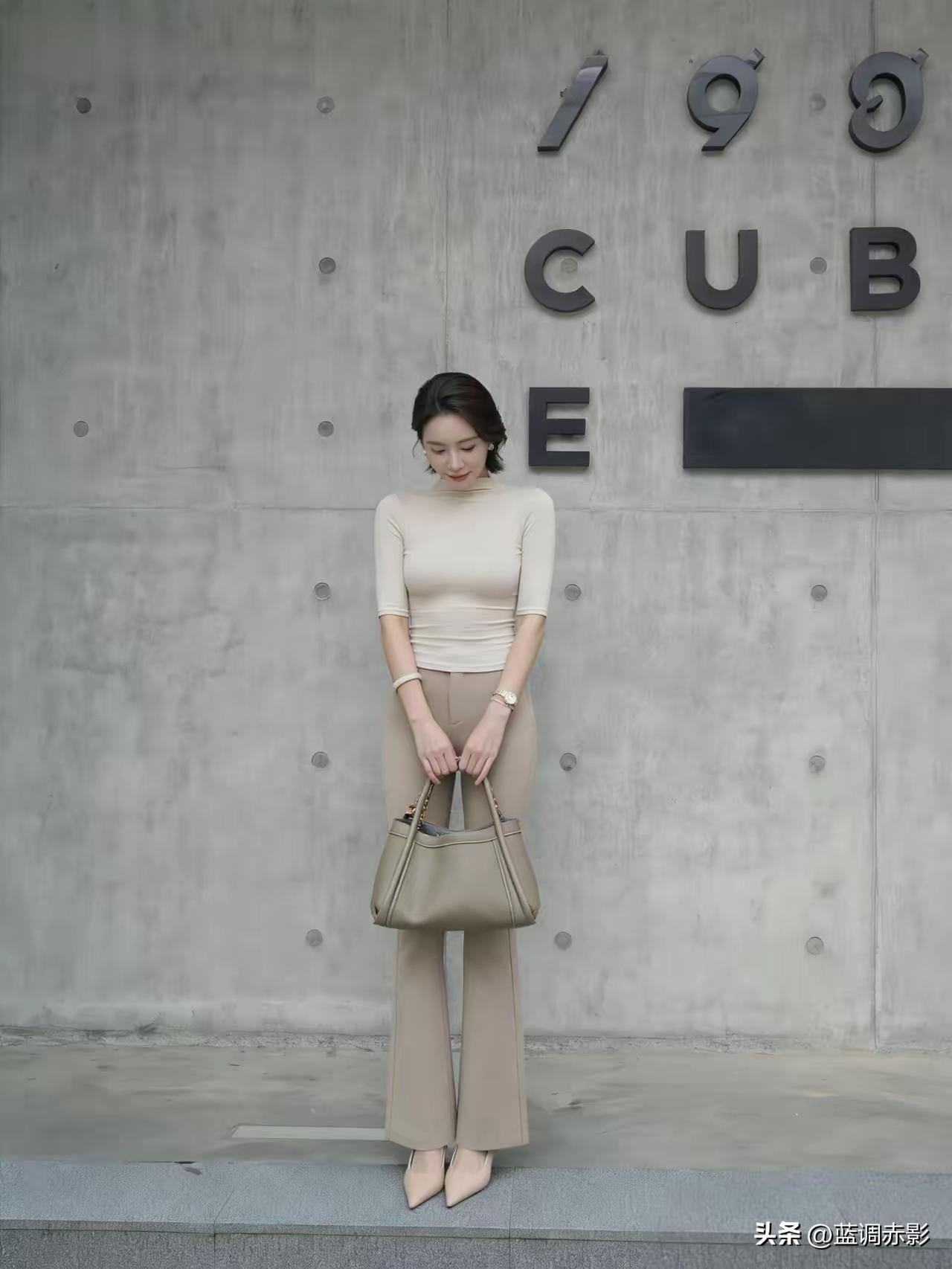 米色高领衫搭配阔腿裤,简约而不失时尚感,手拿小包,气质满分!
