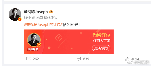 曾舜晞又又发红包了 就是很喜欢这么大方的帅哥,曾舜晞2万剧宣红包,分两次给大家发了,一次都发了一万。曾舜晞2万剧宣红包