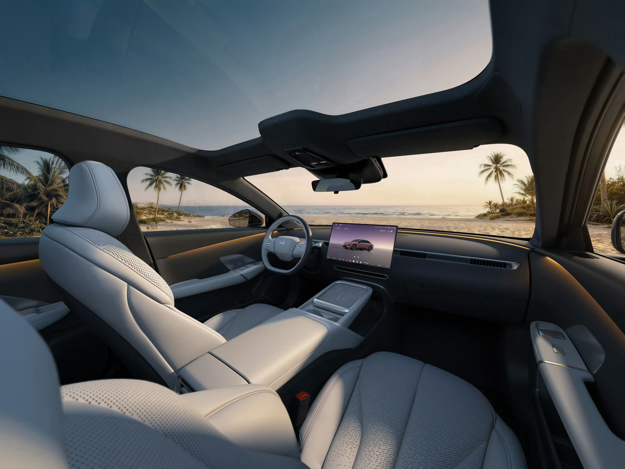三款内饰颜色可选,通过大面积软包、仿麂皮顶棚、金属蚀刻扬声器这些细节,进一步把精致感做实。