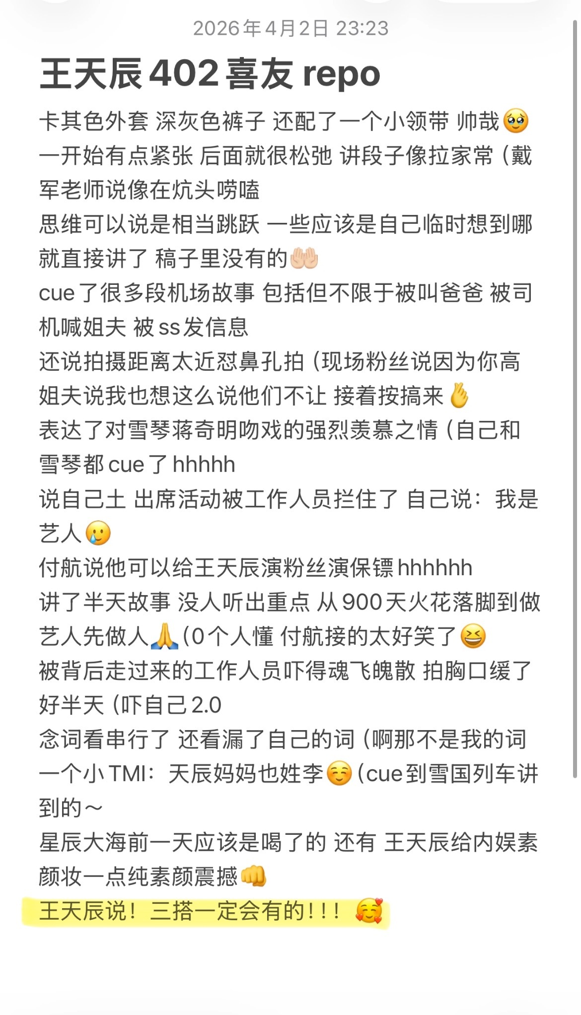 王天辰昨天喜友的repo里cue到和郭晓婷三搭: