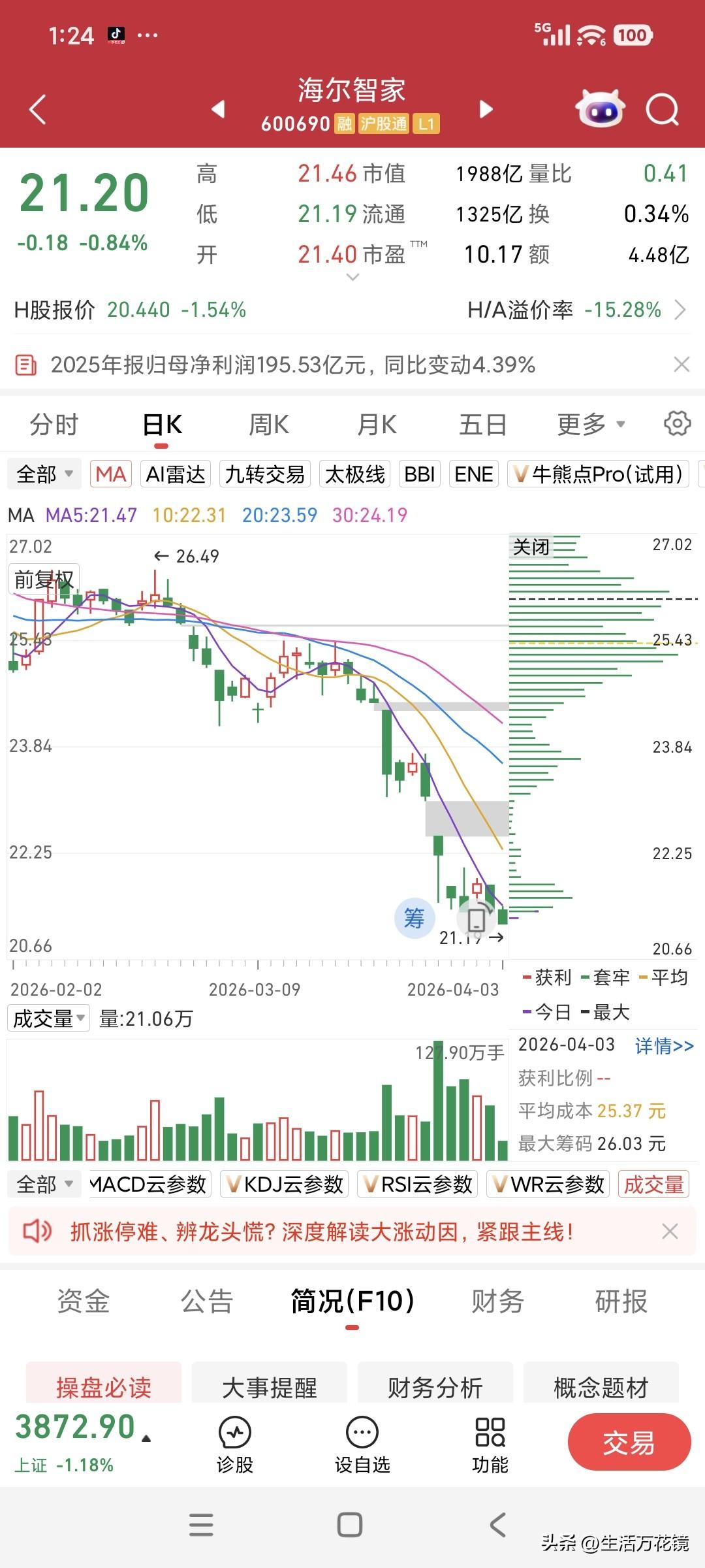 海尔智家2025年归母净利润高达195.53亿元(图1),创下近几年新高,然而股价却跌至近几年的新低(图2、3)。这可害惨了我这个价值投资的忠实信徒,昨天刚开仓,今日就被套牢,心里着实窝火! 海尔开新局 海尔技术创新 海尔投资 海尔精选好家电