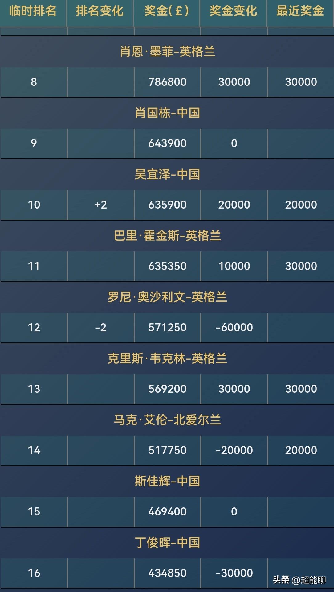 赵心童闯进半决赛,保底斩获4w磅奖金,本赛季累计奖金超过100w磅,再创中国球员的历史记录。临时排名也突破自己的最好成绩来到第4位。 另外肖国栋和吴宜泽分列第9位和第10位,奖金都超过60w磅,斯佳辉和丁俊晖分别排名第15位和16位。这5位中国球员也获得了直通世锦赛正赛的资格。