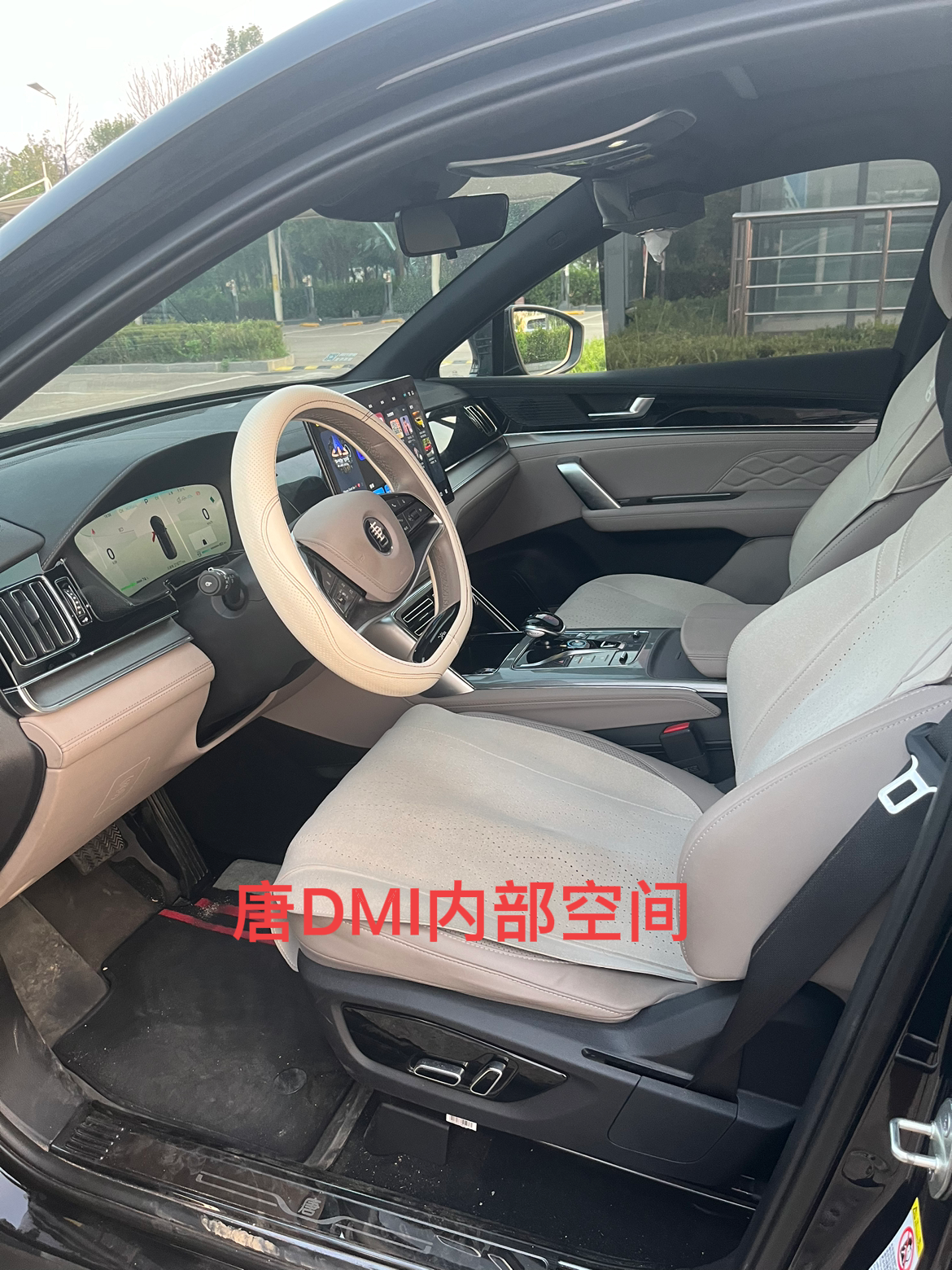 2.唐DMI荣耀版两次试驾的实在感受 唐DMI我一共试驾了两次,第一次是在衡水的4S店,试驾路线是市区道路加一段快速路。动力算不上猛,但绝对够用,起步的时候很平顺,没有燃油车那种顿挫感,快速路超车时,深踩油门能感觉到动力跟上得很快,家用完全没问题。智能语音也比较灵敏,我坐在副驾喊“你好小迪,打开天窗”,几乎是秒响应。 第二次是去石家庄的4S店,特意找了段有坑洼的路面试驾,底盘滤震还不错,小坑小洼过滤得很彻底,就是过减速带的时候颠簸感有点强,不过也可以接受。隔音的话,市区开的时候很安静,速度跑到80码以上,能听到一点风噪和胎噪,但不影响正常聊天,毕竟不是百万级豪车,这个表现我觉得能接受。 最让我满意的是它的实用性,后排座椅放倒后,后备箱能形成一个几乎纯平的空间,上次搬家拉了个小冰箱加一堆纸箱,完全装得下,平时带家人露营,放帐篷、烧烤架也绰绰有余。