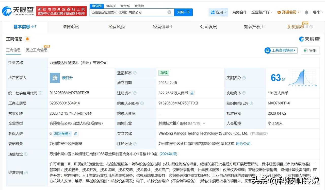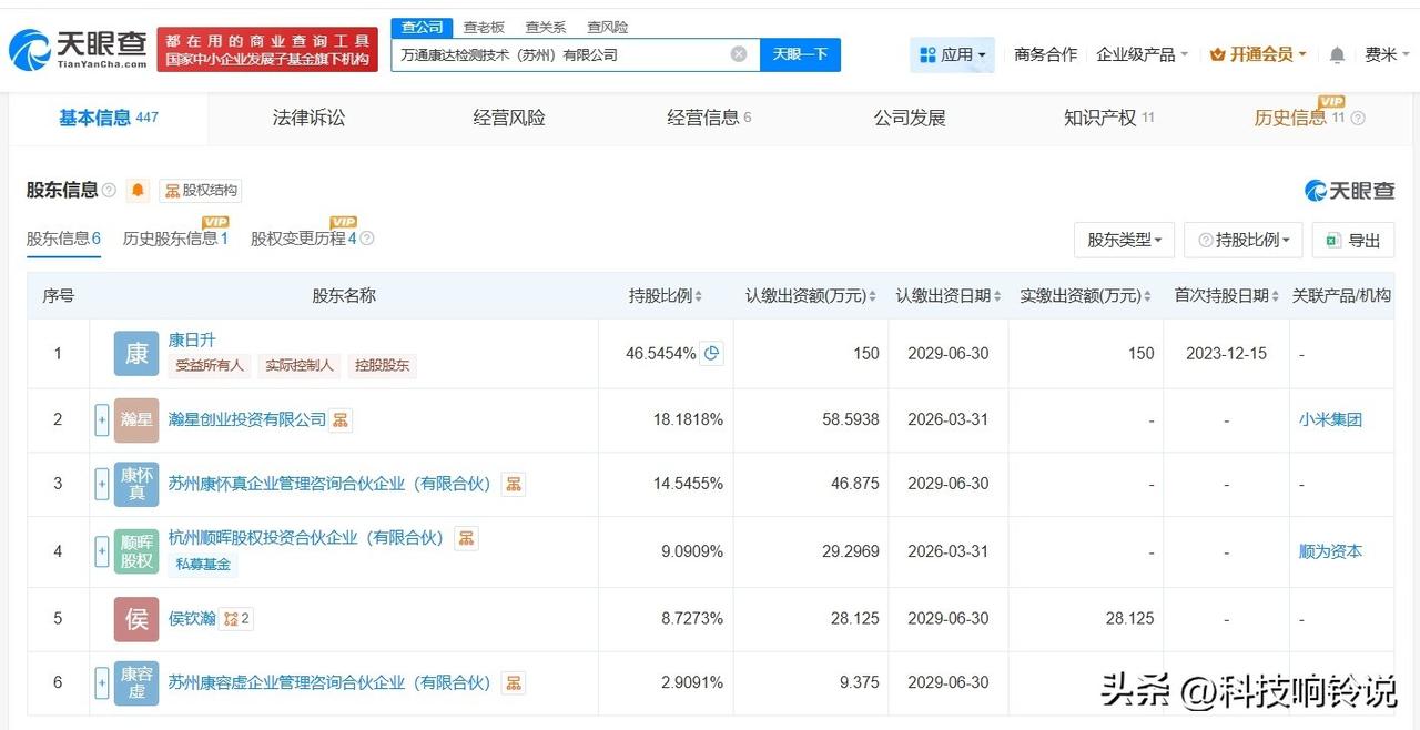 【小米旗下瀚星创投等入股万通康达检测技术公司】 天眼查App显示,近日,万通康达检测技术(苏州)有限公司发生工商变更,新增小米旗下瀚星创业投资有限公司、杭州顺晖股权投资合伙企业(有限合伙)等为股东,同时,注册资本由150万人民币增至约322.3万人民币。 该公司成立于2023年12月,法定代表人为康日升,经营范围含检验检测服务、特种设备检验检测、仪器仪表销售等,现由康日升及上述新增股东共同持股。 天眼查信息:
