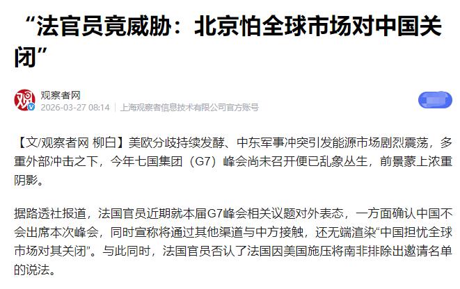 这下中国被“孤立”了! 法国不让中国参加G7峰会,这事听着好像中国被排挤了,其实尴尬的是法国自己。 马克龙刚到日本,转头就定了今年6月G7峰会的名单,里面没有中国。动作是排除中国,目的很直接,就是听了日本的话。日本怕中国来,法国就真不让来了。 可这事有意思在哪?法国之前不是这么想的。马克龙访华的时候,还主动释放信号,想邀请中国去G7。 2025年12月,马克龙专程来华访问,当时的氛围特别好,双方一口气敲定了核能、农食、教育、生态环境等好几个领域的合作文件,签了一堆实打实的合作协议。 马克龙当时说得也特别实在,强调法中要相互信任、相互尊重,还明确表态,法国要推动欧洲战略自主,反对搞阵营对抗,乐见中国经济发展,愿意和中国深化合作,欢迎中国企业去法国投资,给中国企业公平的发展环境。 也就是在这次访华期间,马克龙主动释放了邀请中国参加2026年G7峰会的信号,说白了,他当时的算盘打得很精。 核心就是想借中国的影响力,给自己主办的G7峰会添分量,也为欧洲战略自主挣点话语权。 而且当时法国经济也面临不小的压力,通胀高企,能源对外依存度也高,急需和中国深化绿色技术、新能源装备等领域的合作,邀请中国参会,也是想给两国合作多铺一条路,捞点实际好处。 可这算盘刚打了没几个月,就被日本的阻挠给打乱了。 据法国媒体报道,日本外务省早在2025年底就通过非公开渠道,向法国表达了对邀请中国参会的“深切忧虑”,措辞看着含蓄,立场却异常强硬,后来甚至直接放话,如果法国邀请中国参会,日本可能会拒绝签署峰会联合声明。 日本的小心思其实一点都不复杂,它是G7里唯一的亚洲成员国,一直把G7当成自己在亚太地区扩大影响力的工具,生怕中国参会后,会稀释它在亚洲议题上的话语权,动摇它作为“亚洲代表”的地位。 更关键的是,日本这些年一直想把G7打造成对抗中国的封闭小圈子,万一中国参会,会阻碍它们讨论涉华议题。 所以日本一直不断给法国吹风、施压,拿所谓“价值观不符”当借口,声称G7的团结基于共同的民主法治理念,暗示中国不符合这一标准。 让人没想到的是,一直喊着“欧洲战略自主”的马克龙,居然真的被日本说动了,2026年3月底抵达日本后,刚和日本首相高市早苗会晤,就立刻承诺,6月的G7峰会不邀请中国参会,把之前访华时的表态抛到了九霄云外。 法国这么做,纯属捡芝麻丢西瓜。现在欧盟经济复苏乏力,很多欧洲国家都急需和中国深化合作,就连法国自己的奢侈品、航空航天、核能等产业,都高度依赖中国市场,40%的在华欧企,核心利润都离不开中国供应链。 可法国为了迎合日本,偏偏在外交上和中国保持距离,得罪了中国这个重要的合作伙伴,也让两国2025年访华时积累的合作氛围受到了影响。 反观日本,其实也没真正把法国当回事,之前日本在下一代战斗机研发上,宁愿选择和英国、意大利合作,也没考虑拥有丰富经验的法国,说白了,日本只是想利用法国,达成自己对抗中国的目的而已。 更有意思的是,G7内部本身就矛盾重重,法国就算迁就了日本,也未必能讨好其他成员国。 就拿之前的峰会来说,美国想没收俄罗斯冻结的资产给乌克兰,法国和德国就坚决反对;在巴以问题上,法国支持人道主义休战,美国却投了反对票,英国和日本直接弃权;连东道主关注的难民问题,美国、日本这些国家也根本不上心。 而且美国对法国也一直有牵制,之前法国就曾在美国的施压下,撤回了对南非的G7峰会邀请,这也能看出,法国在G7内部的操作空间其实非常有限。 还有一件特别打脸的事,法国部分官员后来还抛出了离谱言论,说中国是“害怕国际市场设限才不肯来”,这纯属颠倒黑白。 根据法国披露的峰会初步议程,他们计划讨论“引导中国优化内需结构”“规范中国出口行为”等议题,这本质上就是一场预设批评的“鸿门宴”,中方去了也只是浪费时间,理性回避才是维护自身利益的正确选择。 其实大家心里都清楚,中国根本不需要靠G7来证明自己。这些年,中国一直在践行真正的多边主义,深度参与G20、金砖国家、上合组织等机制,和140多个国家和地区保持首要贸易伙伴关系,对全球经济增长的贡献率连续15年超过30%。 2025年,中欧进出口总额就达到了5.93万亿元,就在法国官员放话“要关闭欧洲市场”的同一天,欧洲议会还宣布,派代表团访问北京和上海,这也是欧洲议会8年来首次正式派团访华,德国总理也公开表示,不排除和中国达成新的贸易协议,强调合作不能“一刀切”。这些事实都说明,欧洲根本离不开中国,法国官员的威胁,不过是自欺欺人。 其实法国心里也清楚,气候变化、粮食安全、能源危机这些全球议题,没有中国的参与和合作,根本讨论不出切实可行的解决方案,排斥中国,只会让G7的决议越来越缺乏执行力,越来越边缘化。
